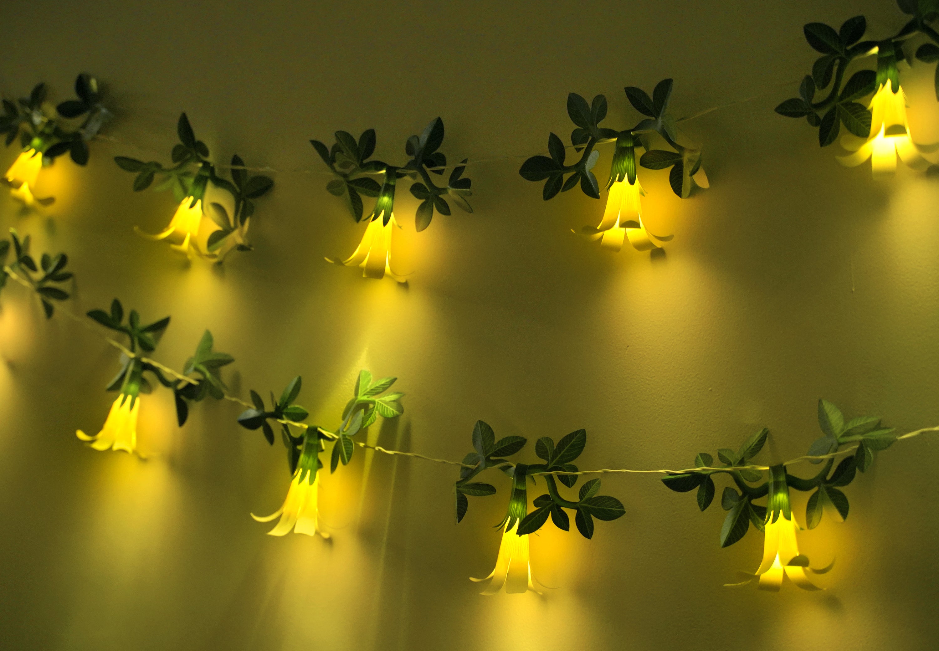 Beautiful white flowers that glow at night, to light up your spaces! This luminous string of 10 flowers that celebrates the beauty of nature, can bring magic into your festivals, home weddings, parties and birthdays. Use it to add beauty to your Pooja room, as torans in entry ways, or create a romantic mood in your bedroom, really easily! The flower lamps transform when lit up, giving a warm bright glow to your space. 12 flower lamps cover the LED bulbs.