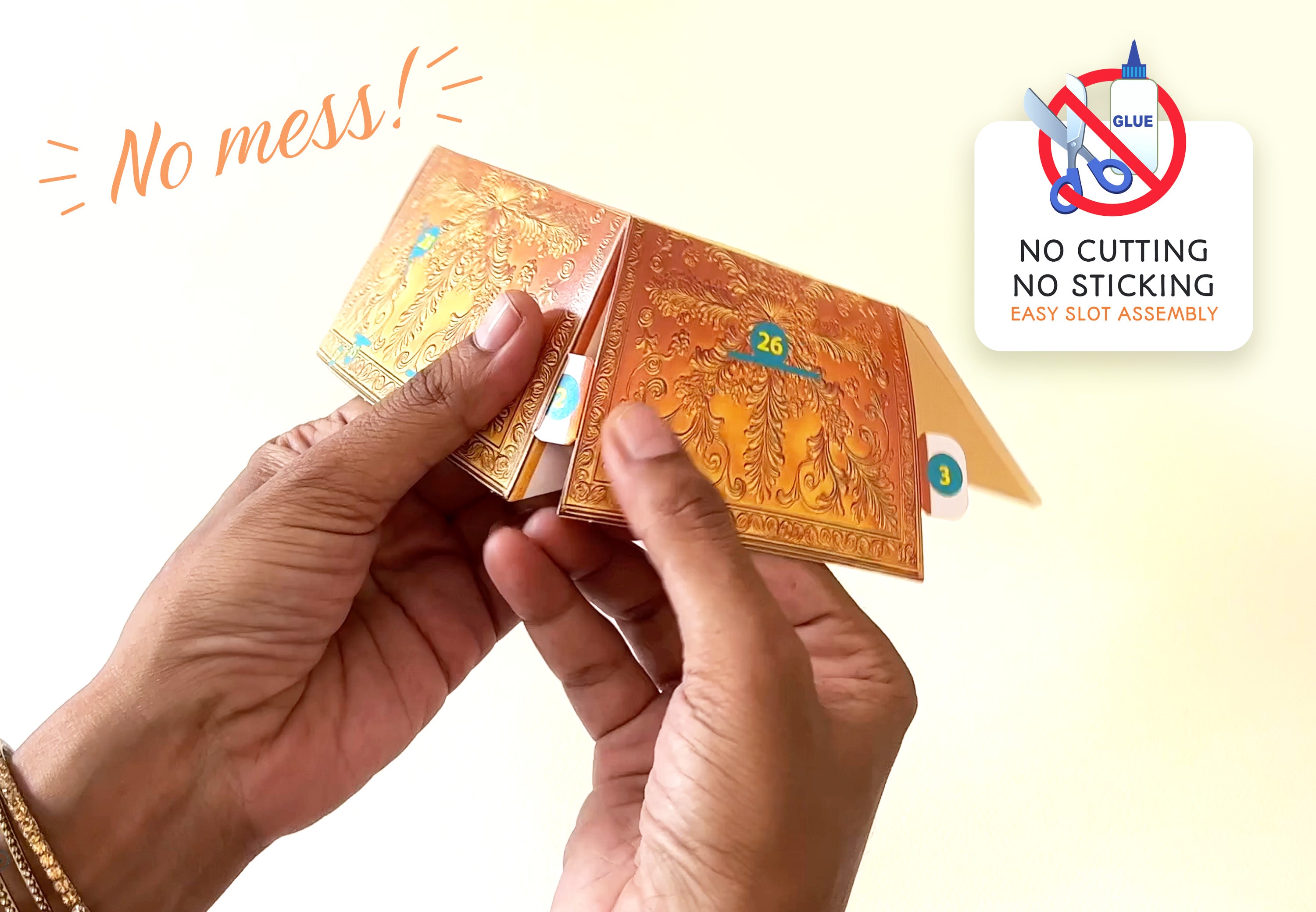 Thoughtfully designed by Sky Goodies and proudly made in India, each kit is crafted with care and attention to detail. Printed on FSC-certified, eco-friendly paper, this pre-cut, pre-creased kit requires no glue. Just slot the pieces together—it’s that simple! Assembly takes just 15–30 minutes, resulting in a charming Ganesha idol sized at 13 x 9.25 x 4.7 inches—perfect for your altar, shelf, or as a thoughtful gift. Best of all, this idol is 100% biodegradable. After the festivities, you can perform a completely eco-conscious Visarjan, knowing the paper will dissolve naturally in water without harming the environment—unlike plastic or plaster idols.
