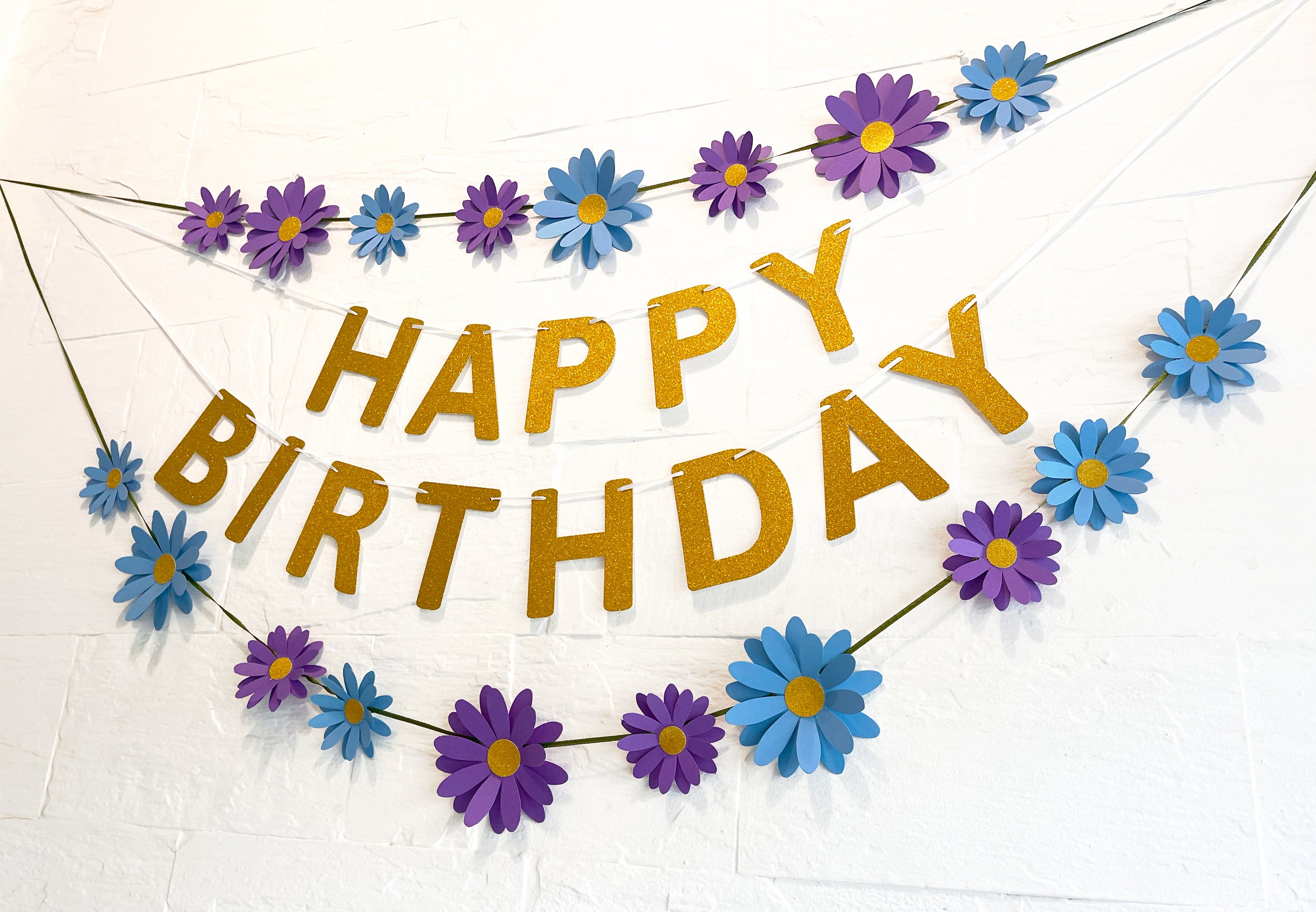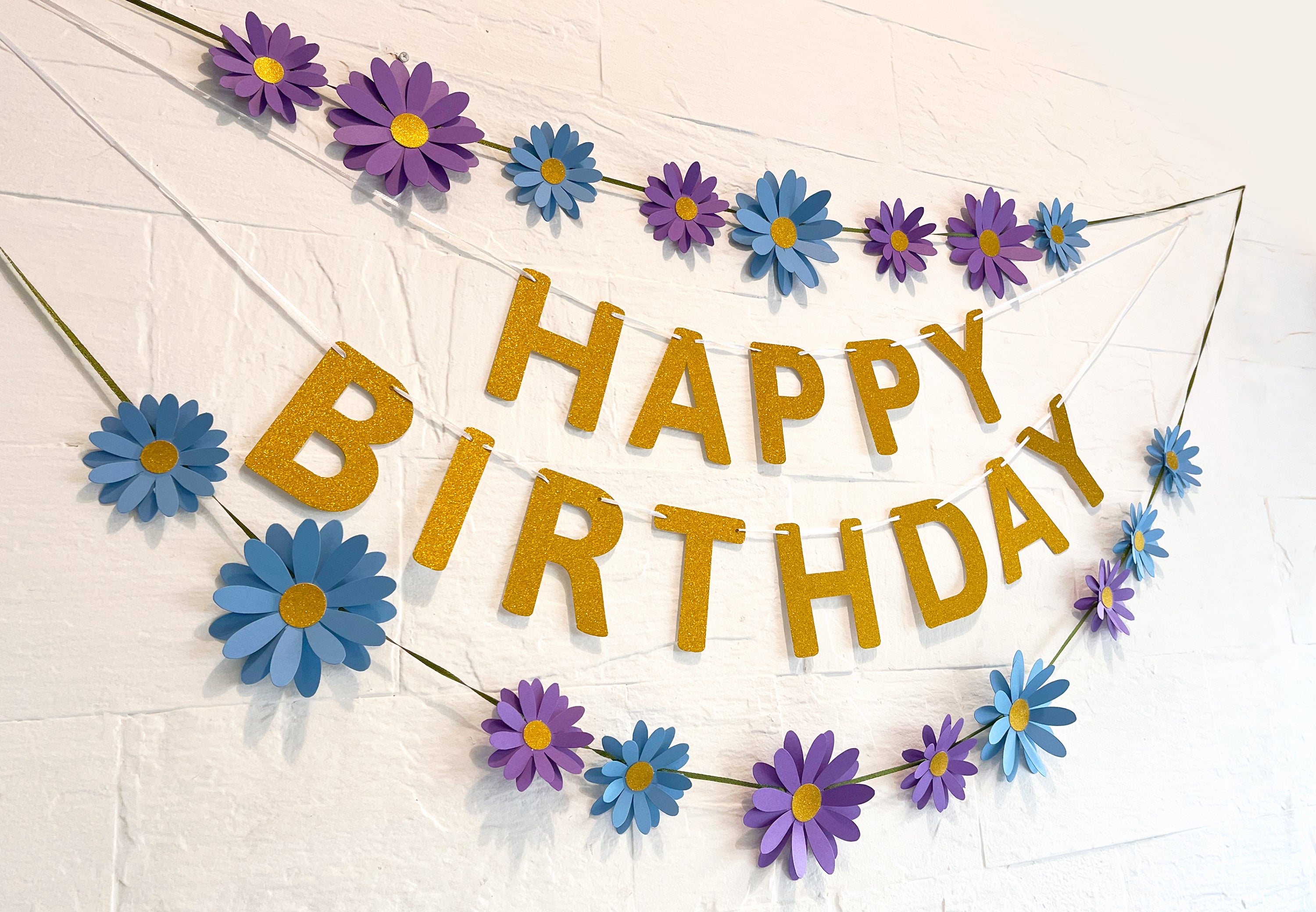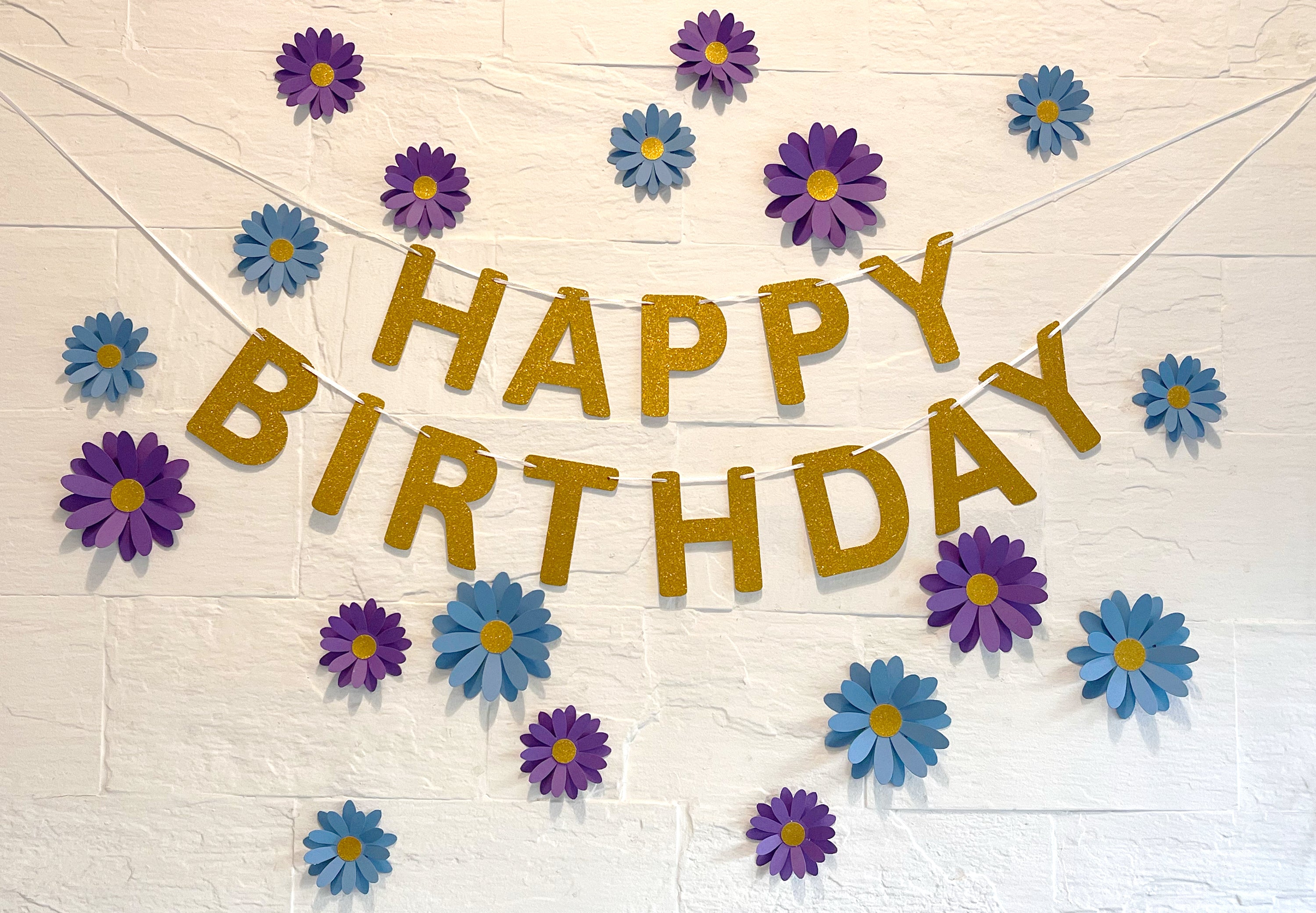 This set comes with 18 double-layered daisy flowers in blue and purple colours, 10 feet of satin ribbon, and glitter-gold 'Happy Birthday' letters. You can choose to hang the bunting vertically or horizontally, or scatter the flowers in any desired pattern on the wall. This bunting is especially useful for home decor for rented spaces, as you don't need to drill holes in the wall... you can simply tape the string to the wall!Â