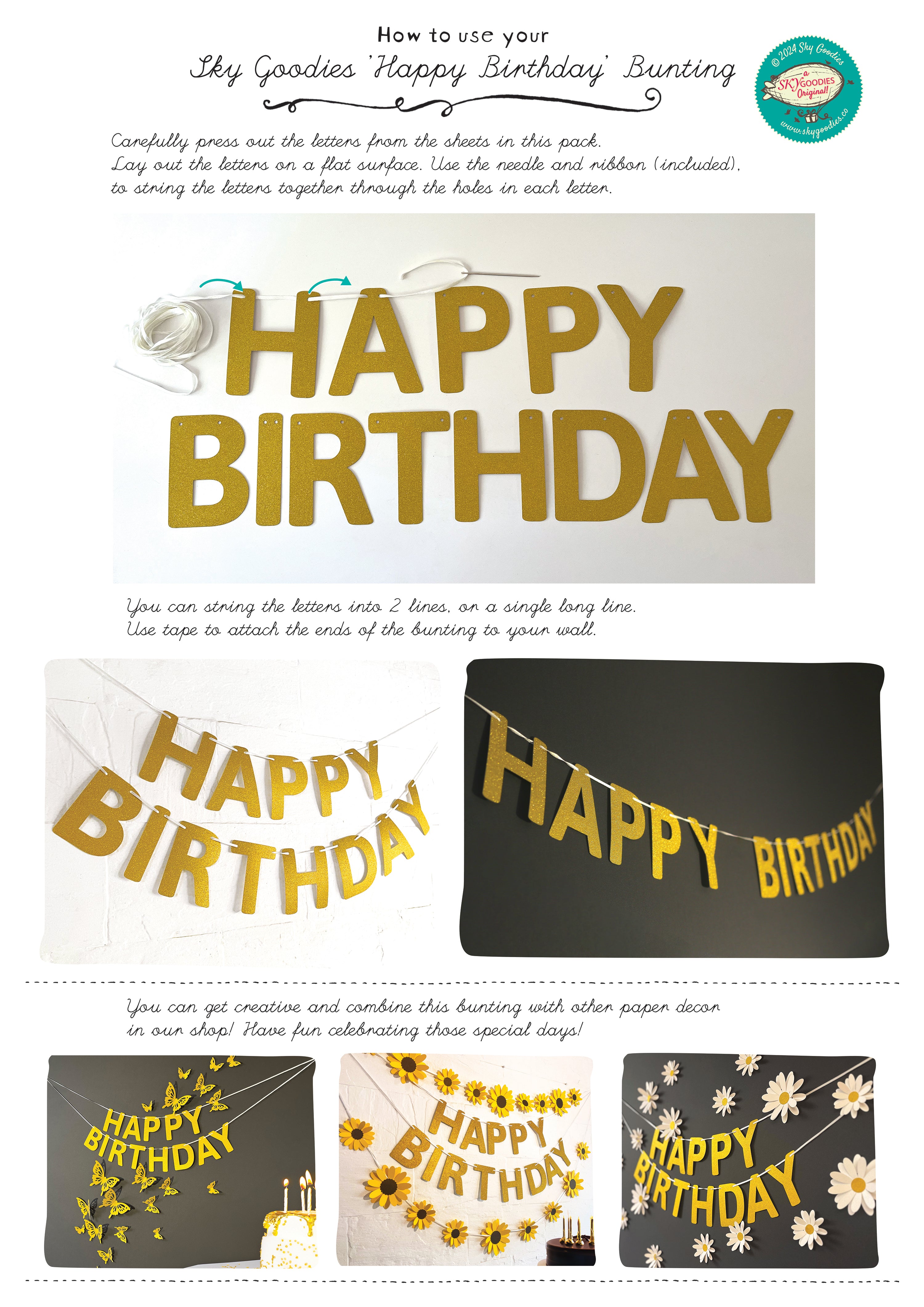 - Glitter-gold paper letters for HAPPY BIRTHDAY, each letter of height 10 cm