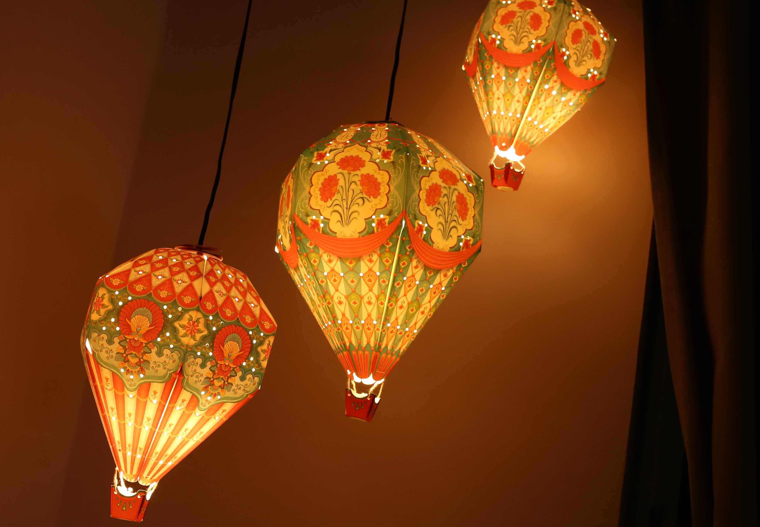A set of 3 dreamy hot air balloons to transform your space! Hanging up these hot air balloon lamp shades in a corner or in a balcony, will create a magical mood and warm cosy ambience.