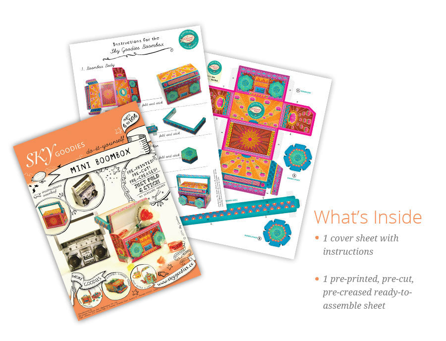 - 1 pre-printed, pre-cut, pre-creased A4 size sheet, with the mini boombox design, printed on FSC certified paper from responsible sources.