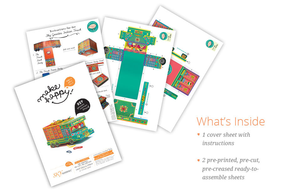 - 2 pre-printed, pre-cut, pre-creased A4 size sheets, with one mini truck design.