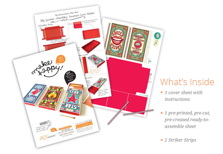 - 1 pre-printed, pre-cut, pre-creased A4 size sheet, with the matchbox visiting card design.