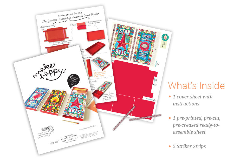 - 1 pre-printed, pre-cut, pre-creased A4 size sheet, with the matchbox visiting card design.