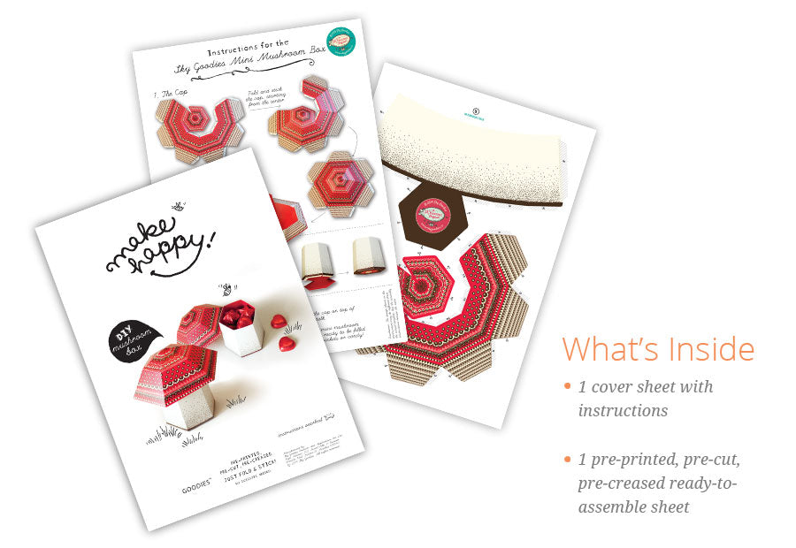 - 1 pre-printed, pre-cut, pre-creased A4 size sheet, with the mushroom design.