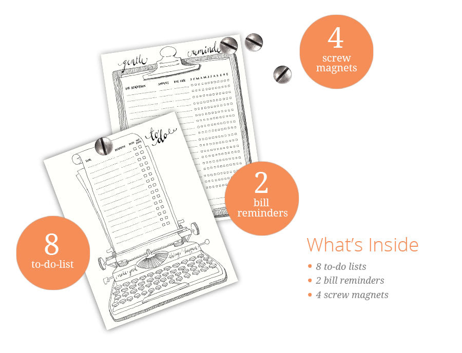 These organizers are artistic and hand-drawn, adding a bit of cheer to your daily mundane tasks. Attach them to your fridge with the screw magnets included, pin them onto your soft-board, or file all the sheets in one folder for easy reference.
