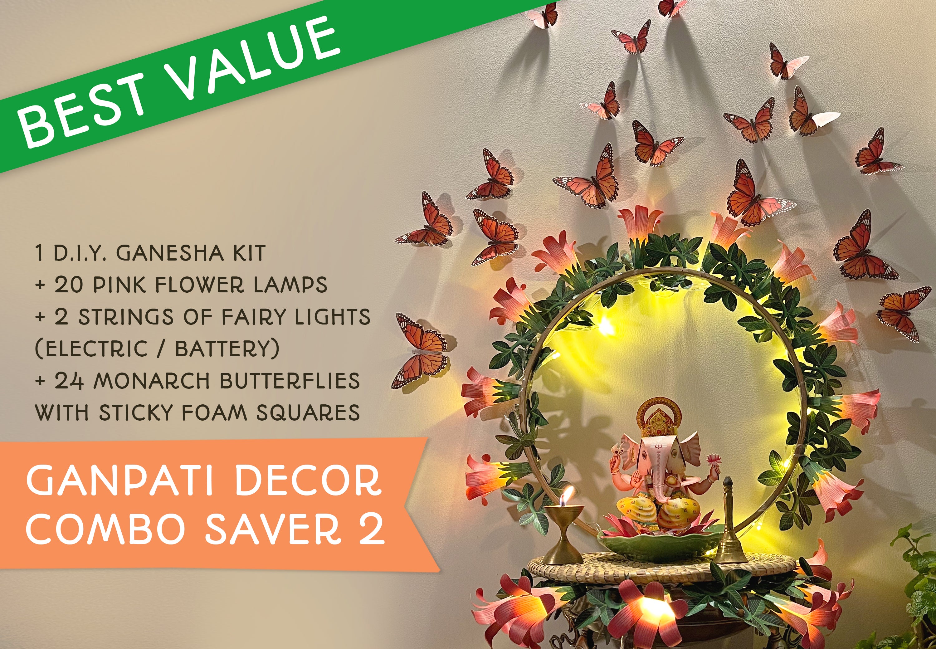 This combo saver pack includes 1 DIY Paper Ganesha, 2 strings of Pink Paper Flower Fairy lights and 24 Monarch Butterflies. The lamps transform when lit up, giving a warm bright glow to your Ganpati set-up with the look of a mystical garden.