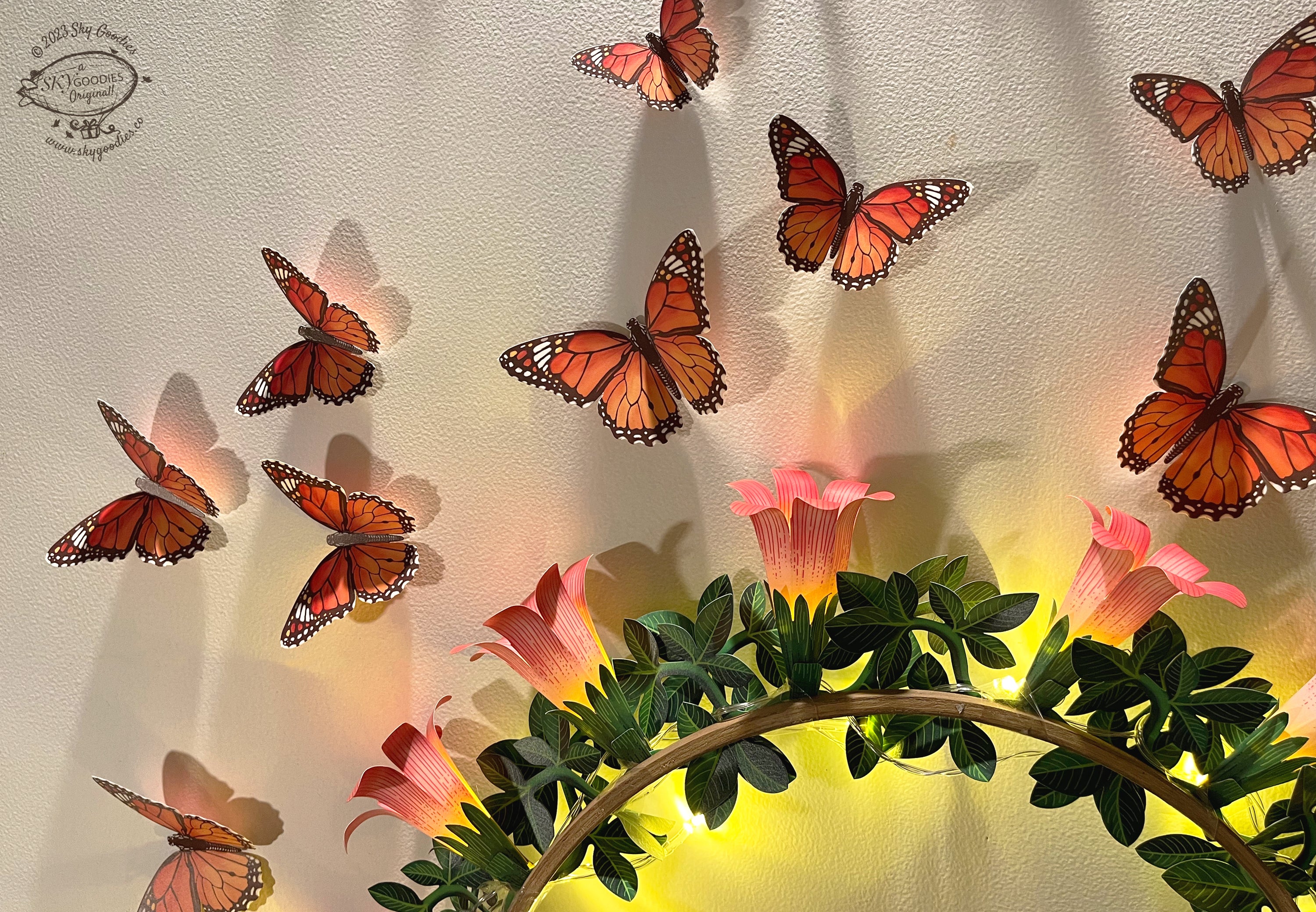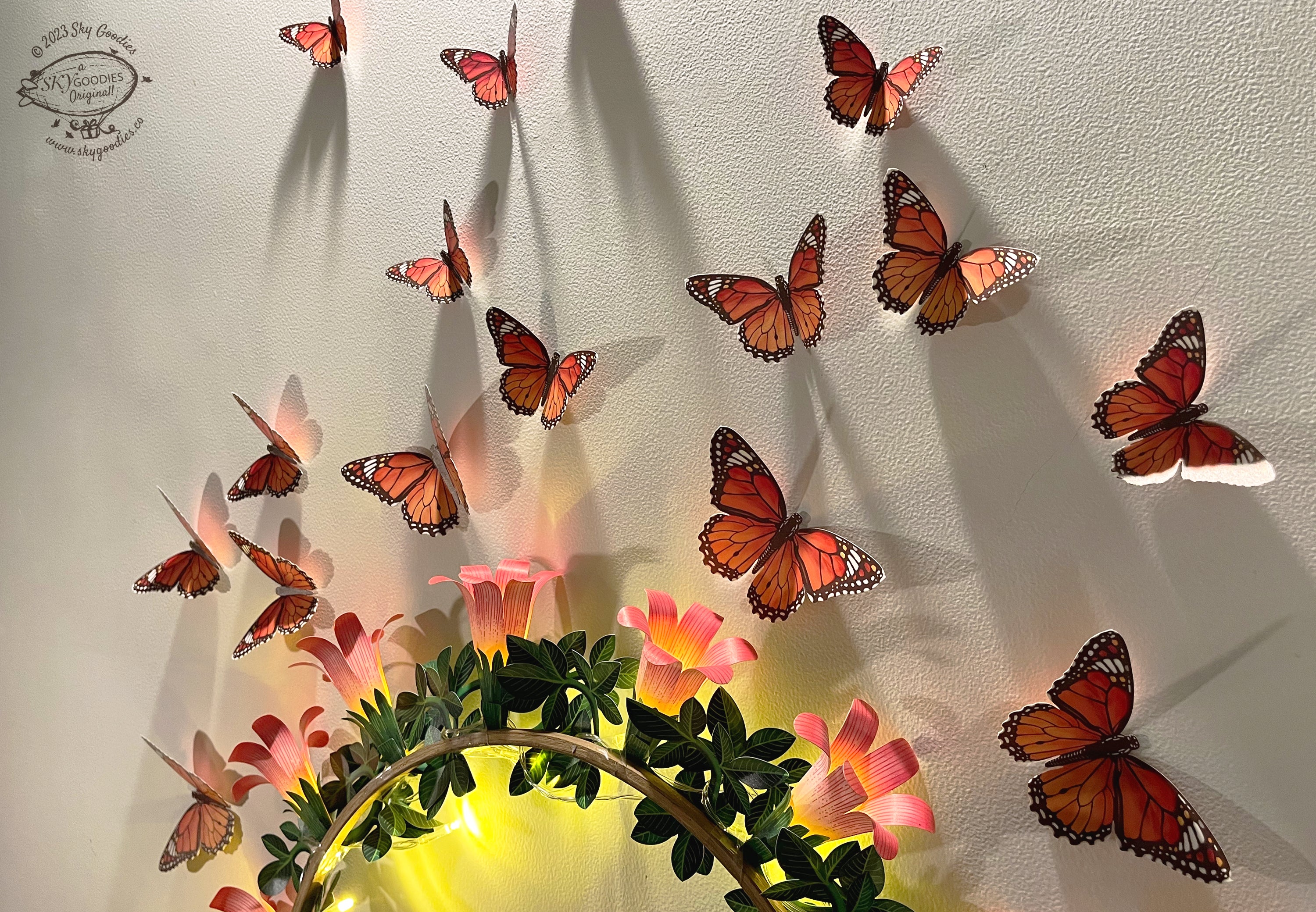 Butterflies: This pack contains 24 pre-cut paper realistic monarch butterflies in assorted sizes, the average size being 3.5 by 2.5 inches. They come with sticky foam squares to attach them easily to any surface. No extra glue is needed.