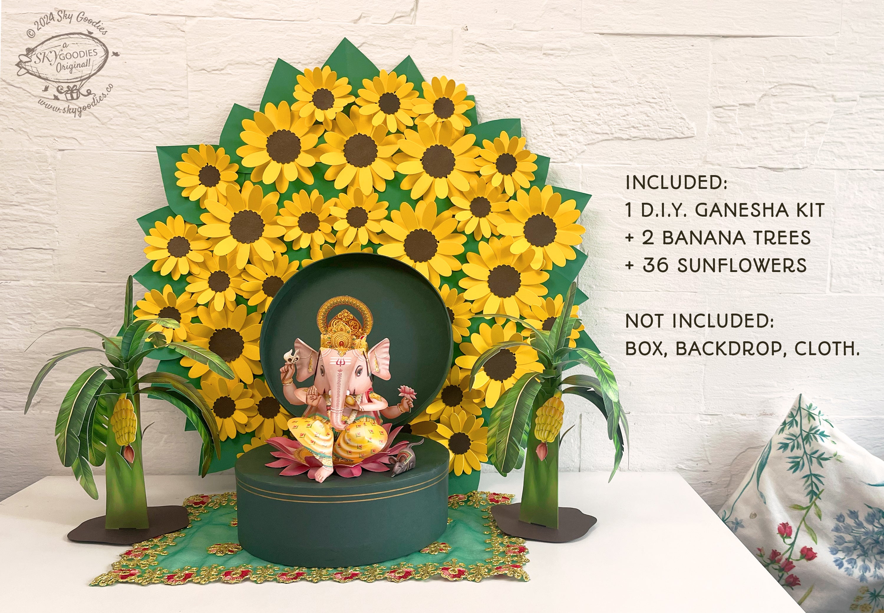 This combo saver pack includes 1 DIY Paper Ganesha, 2 Banana Trees and 36 Sunflowers. The Green Box, Backdrop and cloth pieces are NOT included.
