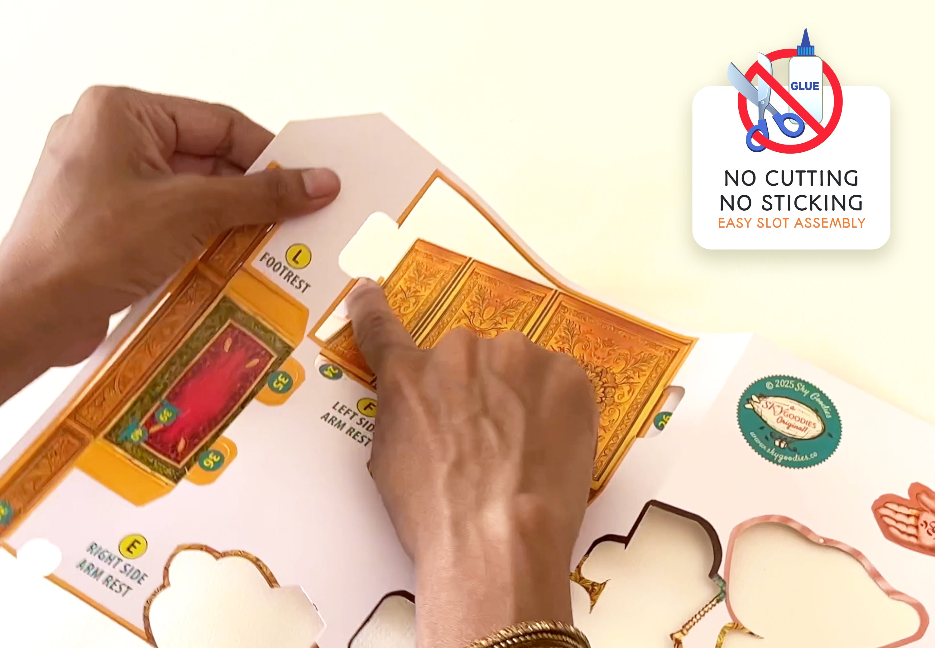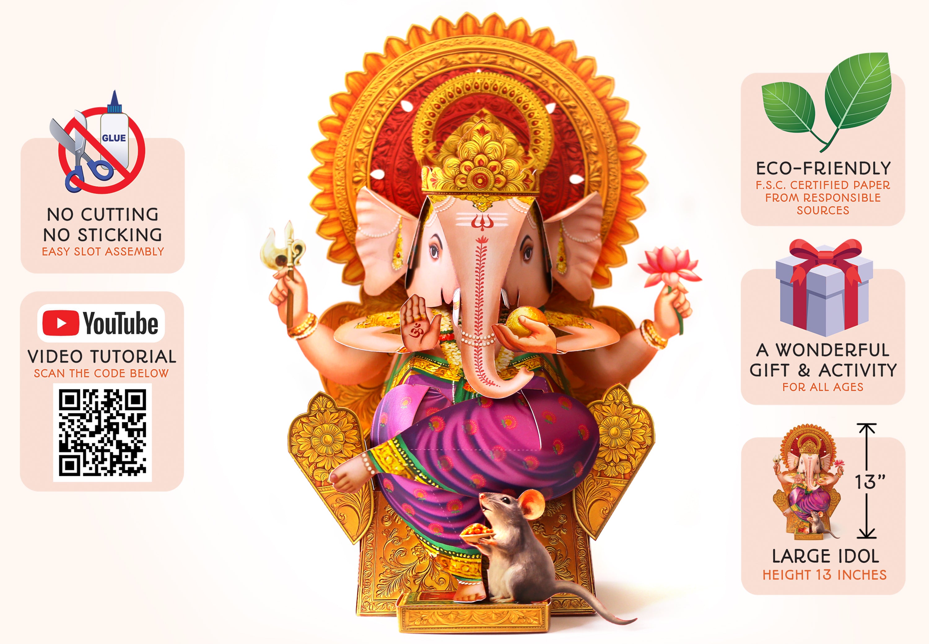 Ganpati: The joy of making your own God idol is much more than buying a ready-made one. This paper craft kit is an original design by Sky Goodies, designed and made in India, with a lot of love and attention to detail. Printed on FSC certified paper from responsible sources, it is a pre-cut and creased kit, with no sticking needed. The assembly is simple, using slot mechanism, and takes about 15 - 30 minutes. Each kit makes an idol of Ganpati 13 x 9.25 x 4.7 inches, to keep in your home temple, and perfect for Eco-friendly Visarjan on Ganpati festival (submerging the idol in water). The paper of the idol will dissolve in river or sea water in a few days, and will not pollute our Mother Earth like Plastic or Plaster of Paris idols. The paper used is thick high-quality card, and the finished idol is sturdy... it doesn't fly away under the fan. It can be dusted and cleaned with a dry cloth.