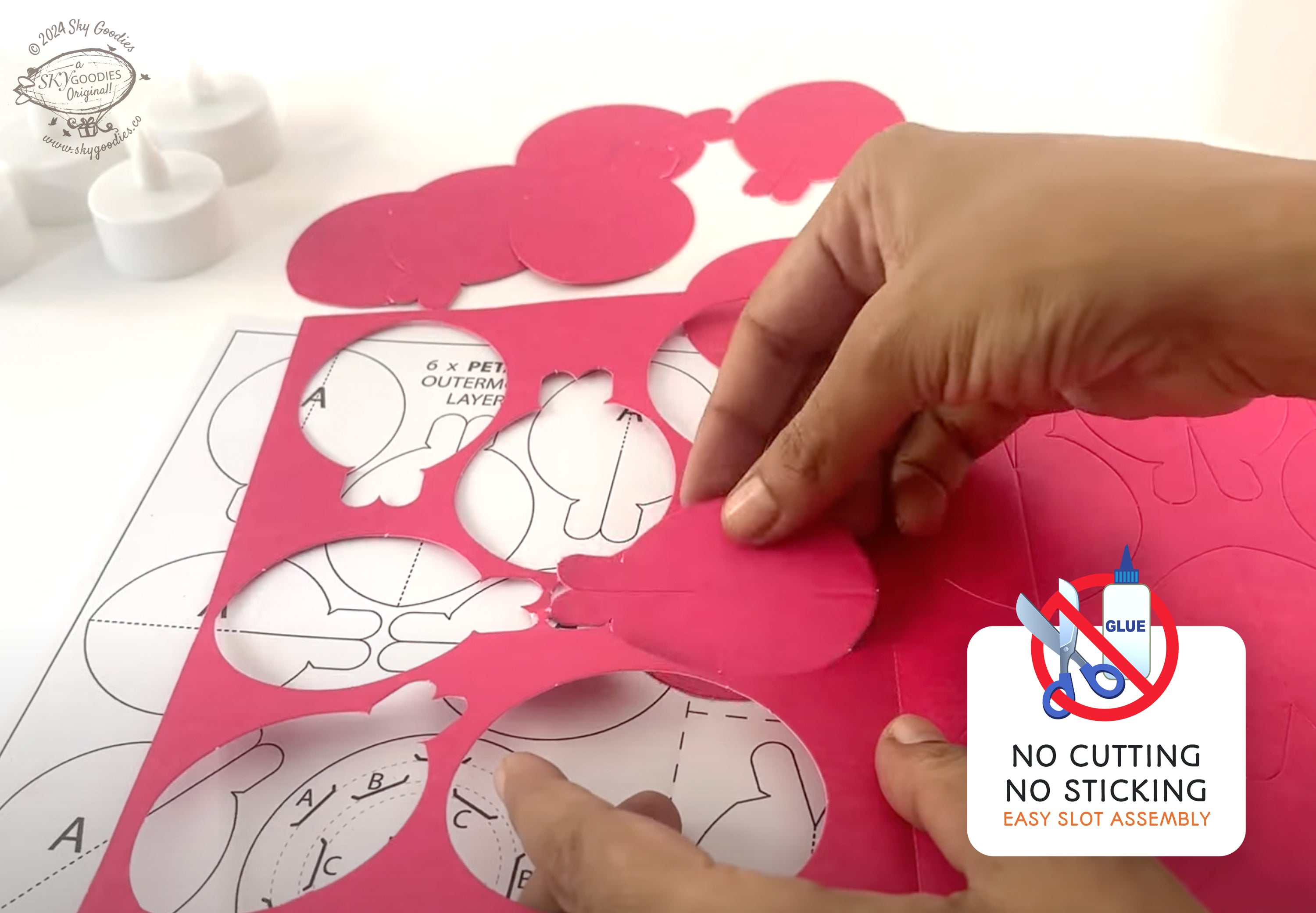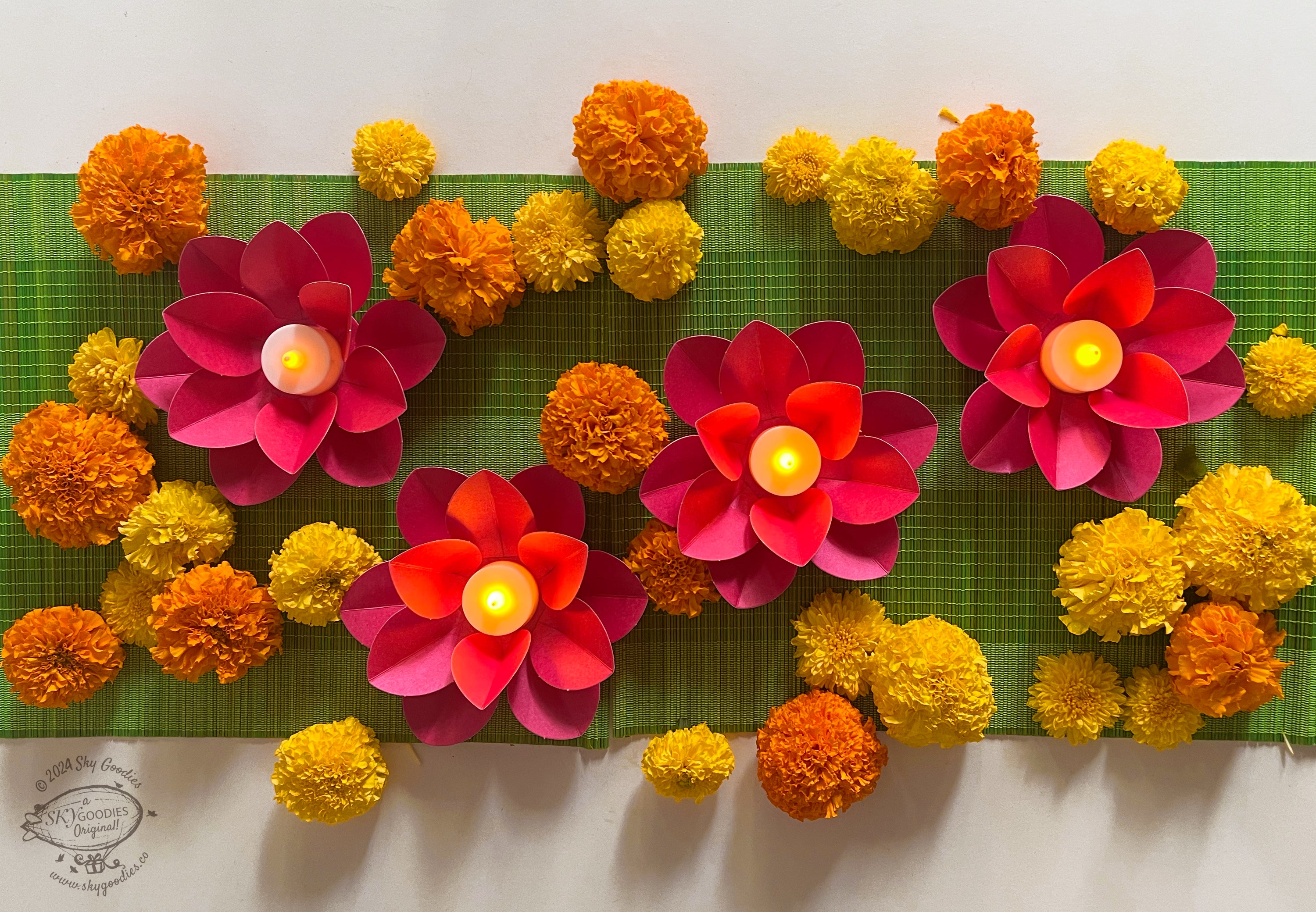 Lotus Diyas: This pack contains 4 Lotus flowers designed to elegantly hold electric tea lights, as an easy-to-assemble DIY kit. No cutting or sticking is needed. 4 electric battery-operated smokeless tea light candles are included.