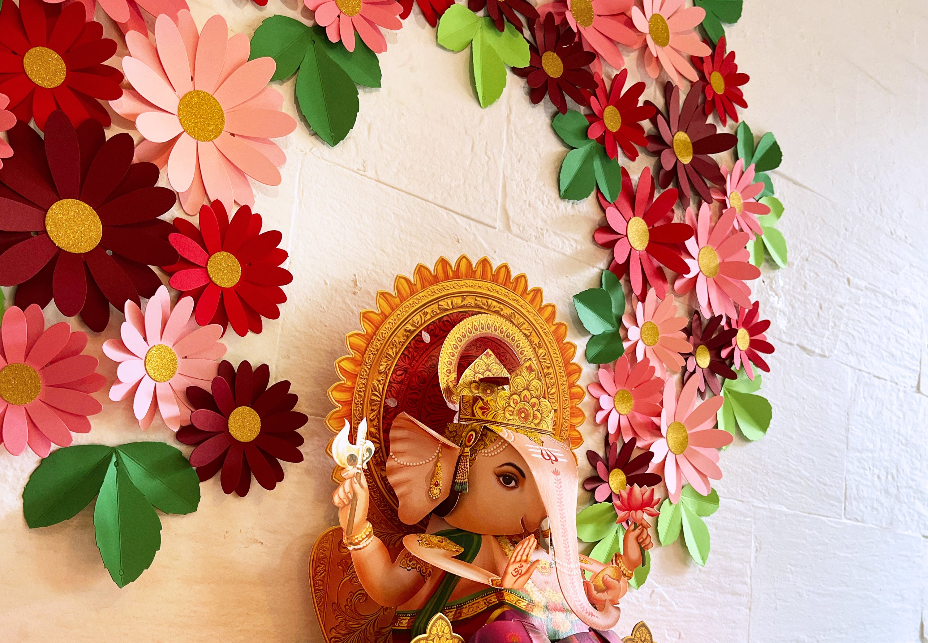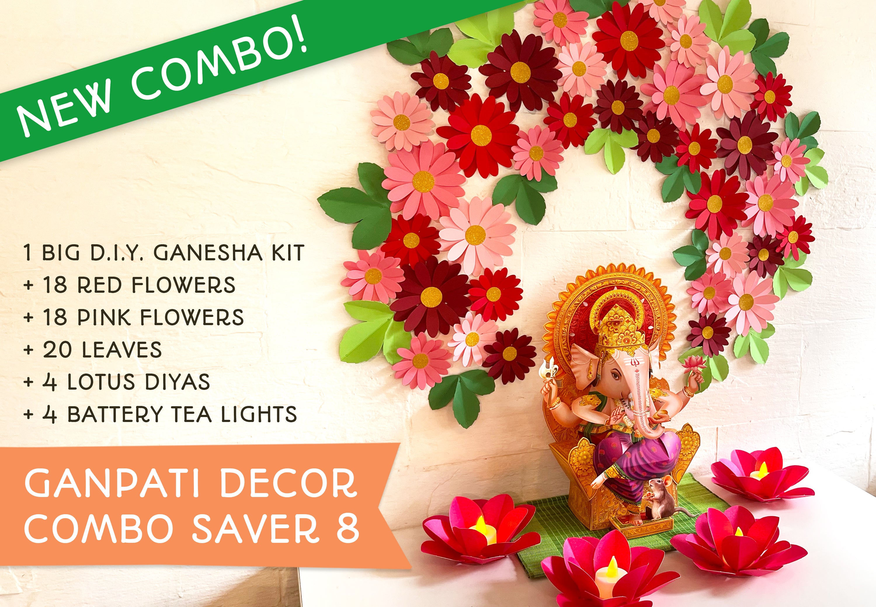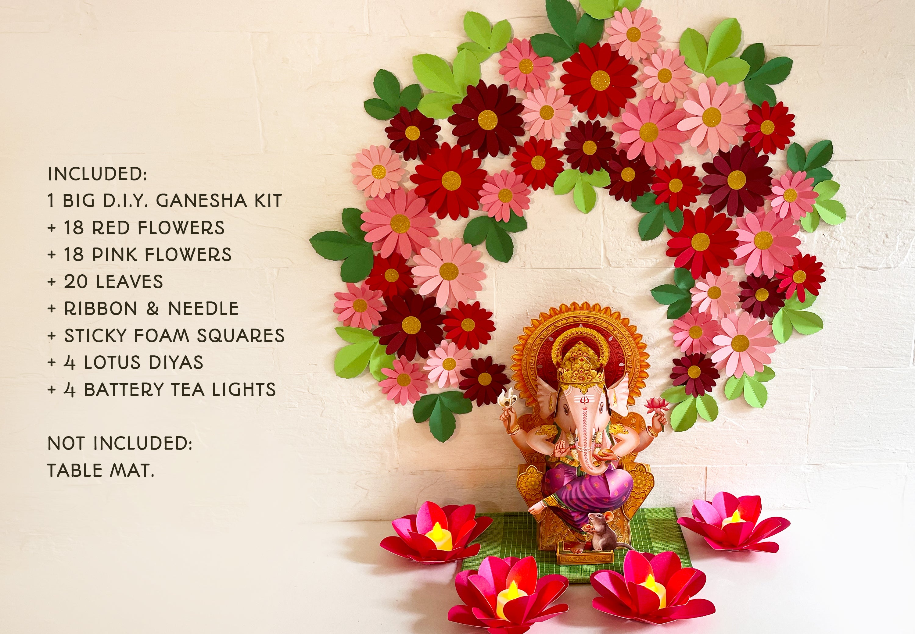 The prettiest floral decoration for your Ganesh Pooja! This combo saver has our new grand Big Ganesha DIY Kit, 18 pink paper flowers, 18 red paper flowers, 20 leaves, and 4 pink lotus diyas with tea lights. The idol and flowers are eco-friendly and biodegradable. You can use the flowers and leaves as strings for a backdrop, or stick them directly on the wall using the sticky foam squares included in this pack. Use your own creativity and ideas to make a beautiful Ganpati pooja setup using easy-to-install pieces in this Ganpati decoration pack.