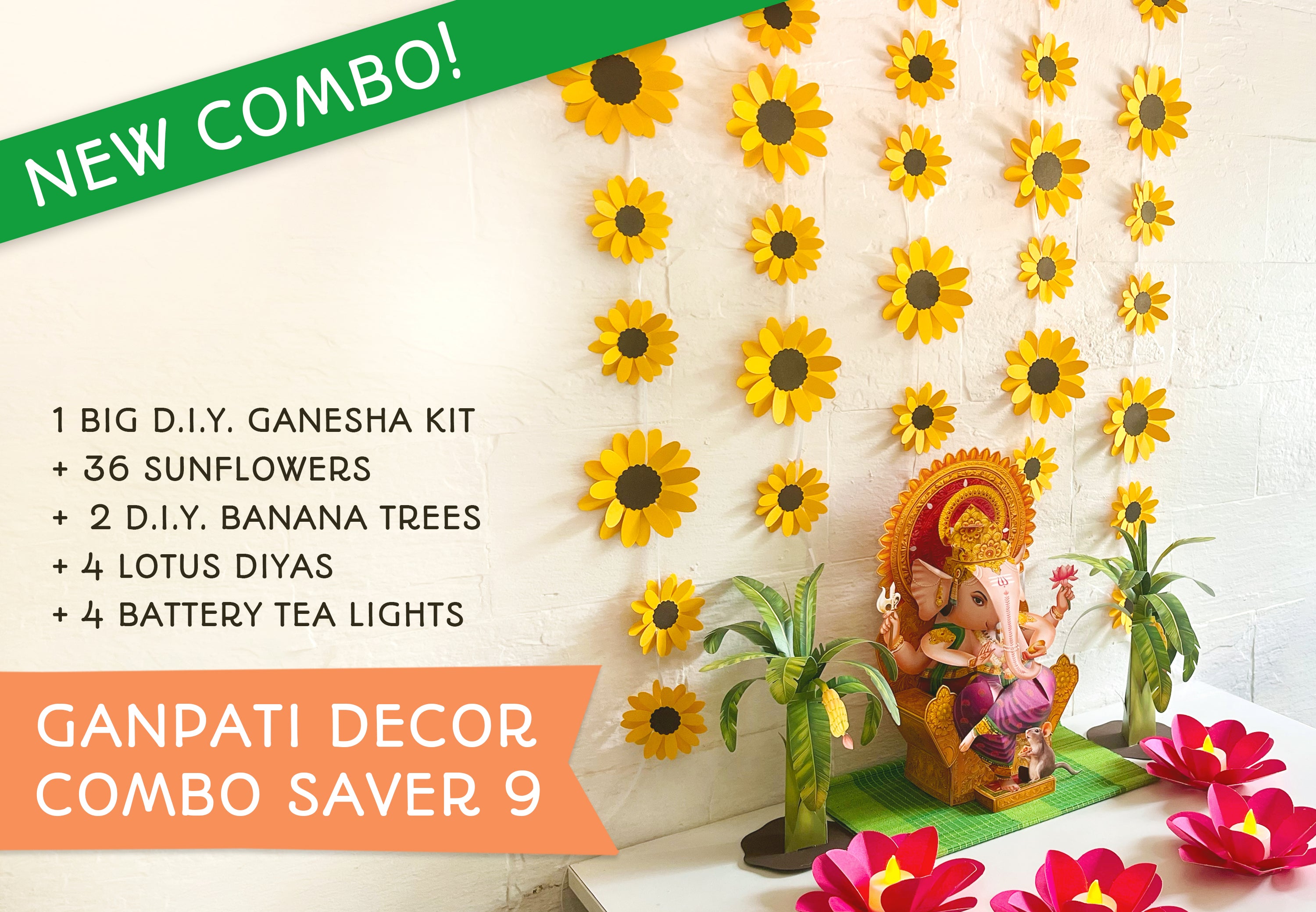 Bring the spirit of celebration home with this vibrant Festive Paper Decor Set, designed to make your pooja space come alive with colour and joy! This thoughtfully curated set includes 36 bright paper sunflowers, 1 large 13 inches tall DIY Ganesha paper idol, 2 lush banana trees, and 4 elegant lotus diyas with electric tea lights—everything you need to create a stunning, eco-friendly festive corner for Ganesh Chaturthi, with your loved ones.