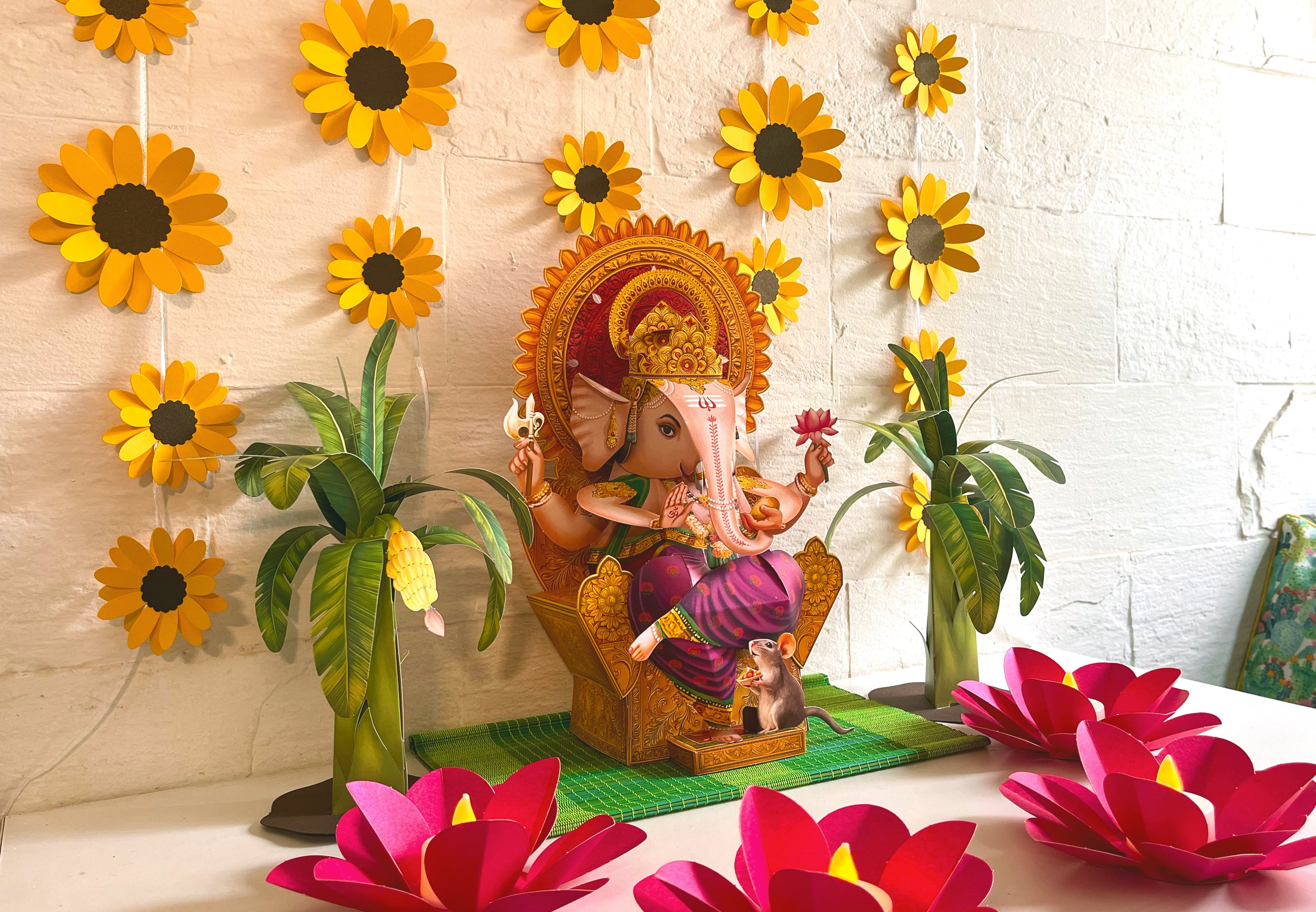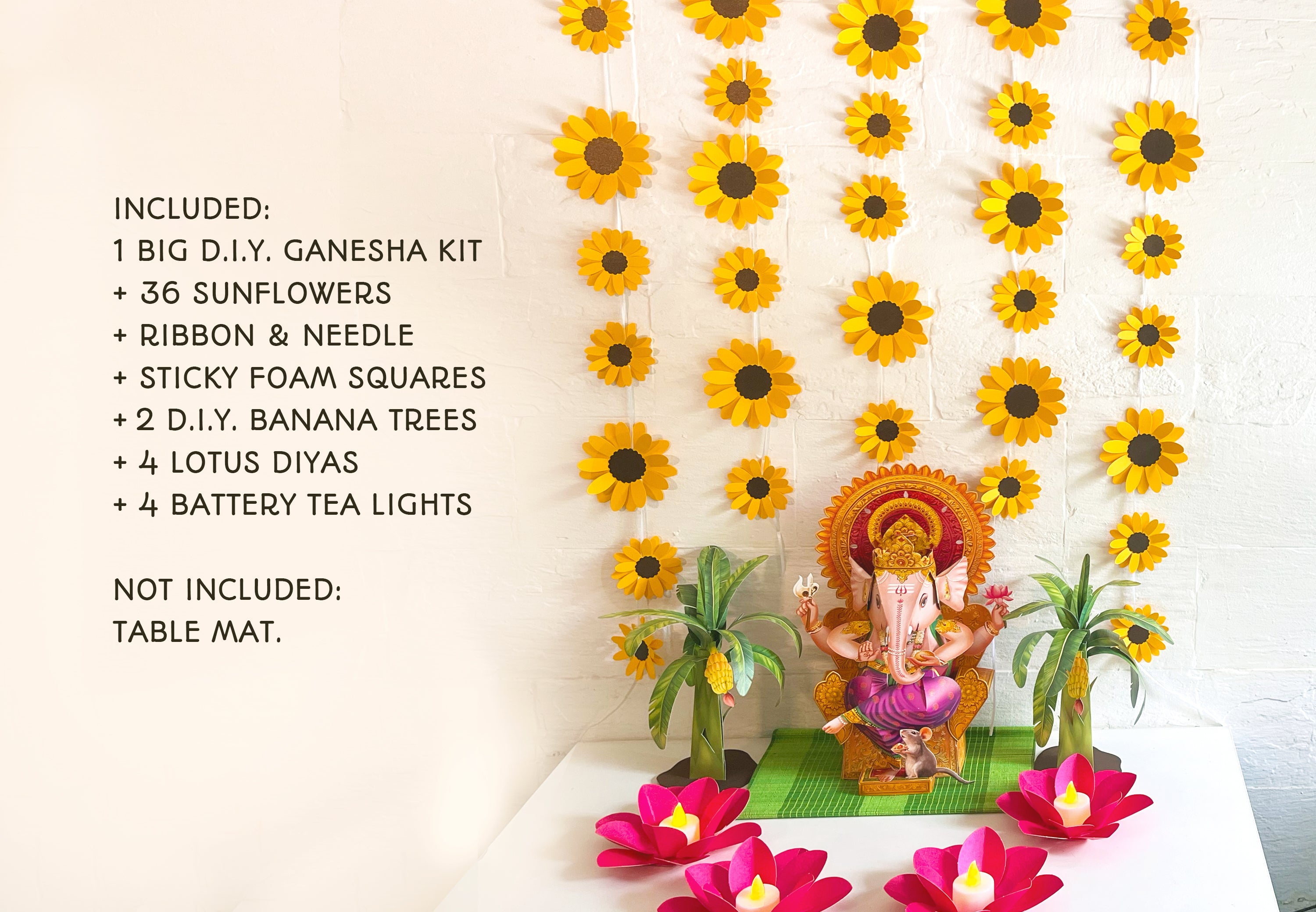 The DIY Ganesha idol is the heart of the set—a meaningful activity for families to assemble together, making your worship even more personal and memorable. The paper sunflowers add a burst of sunshine to your decor, while the banana trees bring in an auspicious traditional touch for Indian celebrations. The lotus diyas, complete with electric tea lights, glow safely and beautifully, adding that perfect festive sparkle.