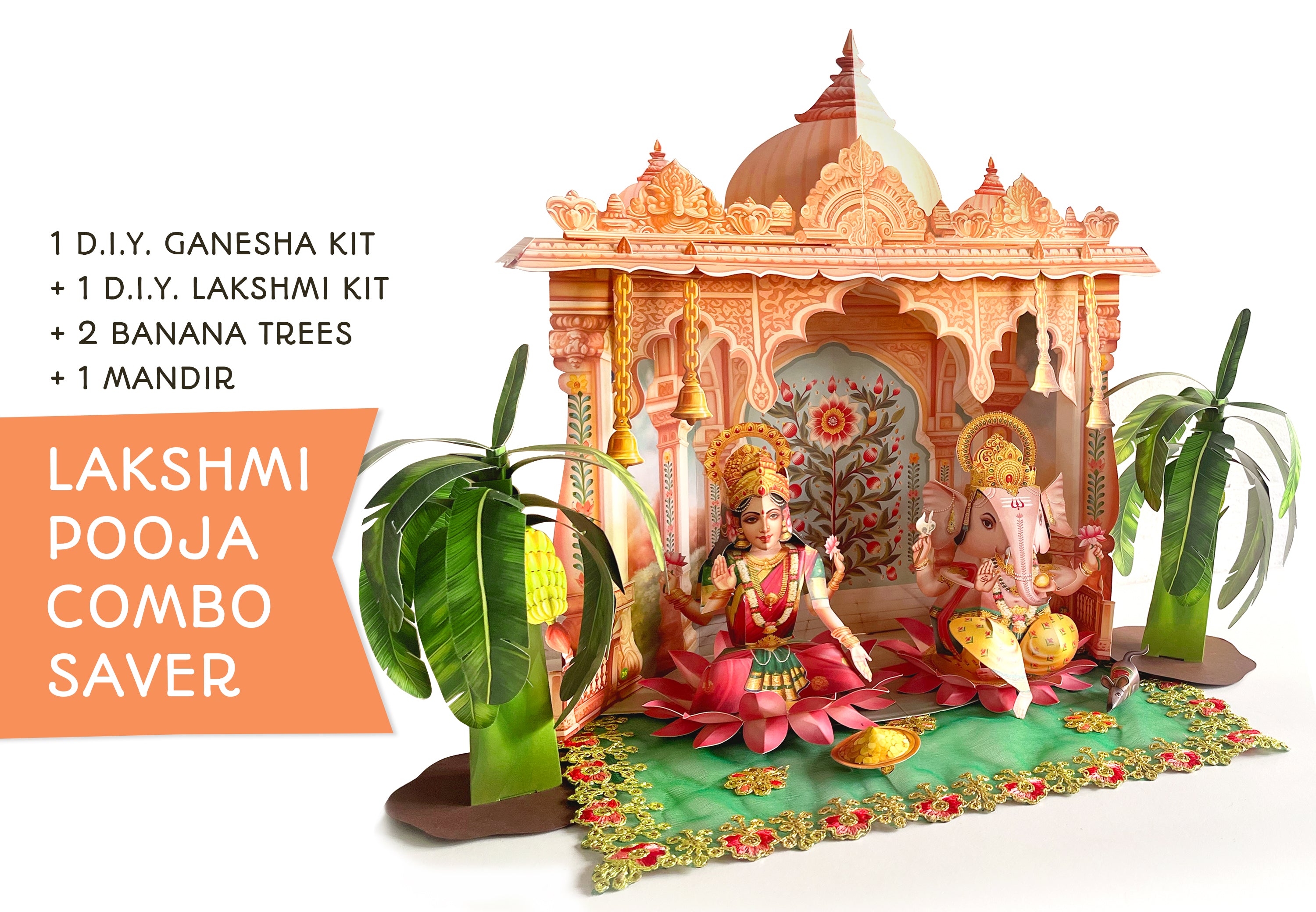 The DIY Mandir or Makhar is unique Puja Decoration for your home... this 15 inch high temple comes as a D.I.Y. Paper Craft Kit which can be assembled easily within 15 minutes! This Combo also includes Paper Craft DIY Kits to create a beautiful, hand-crafted Ganesha idol, Lakshmi idol and 2 Banana Trees. There is no sticking or cutting involved; the sheets come pre-cut and creased, and the assembly is with simple slots.