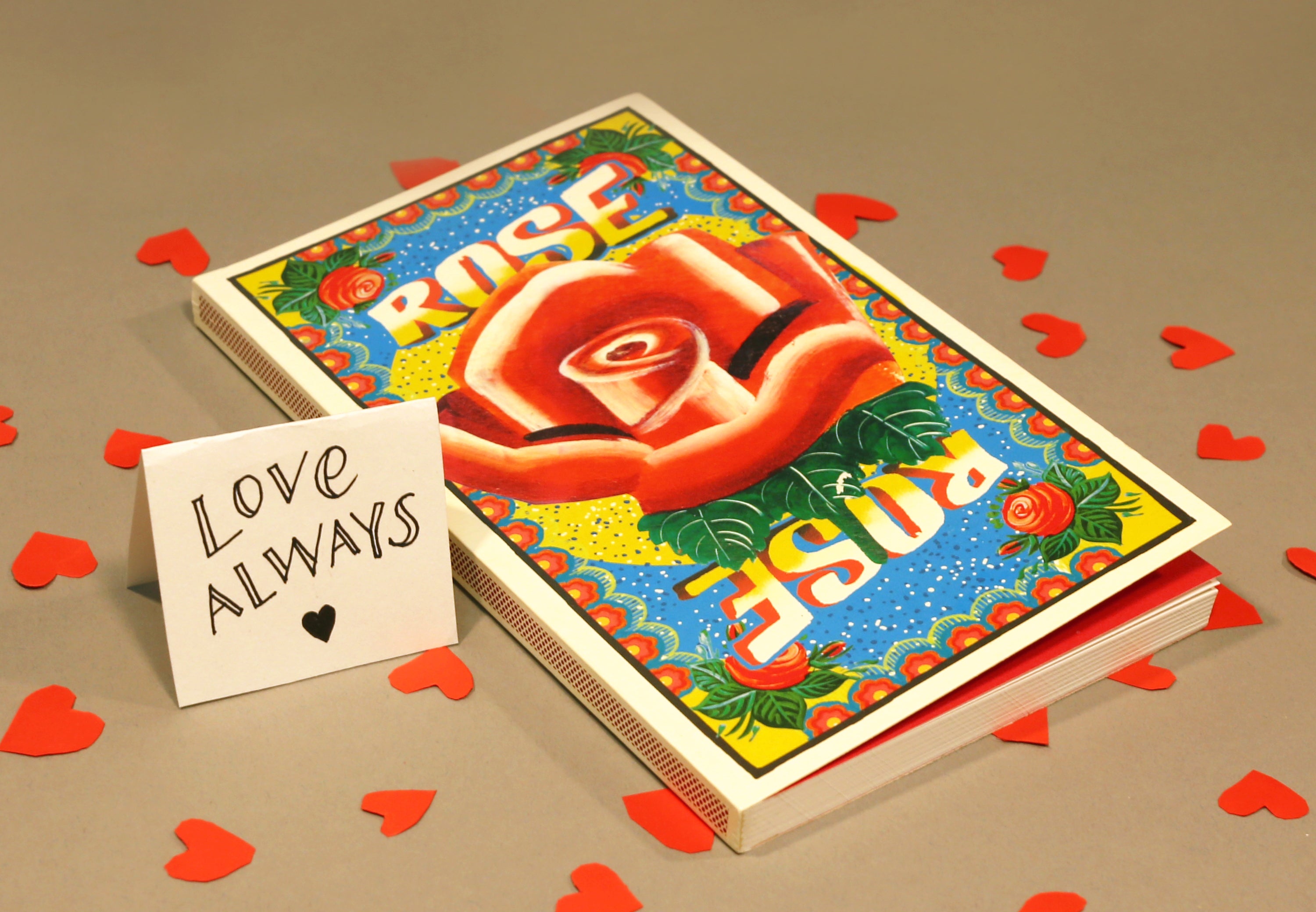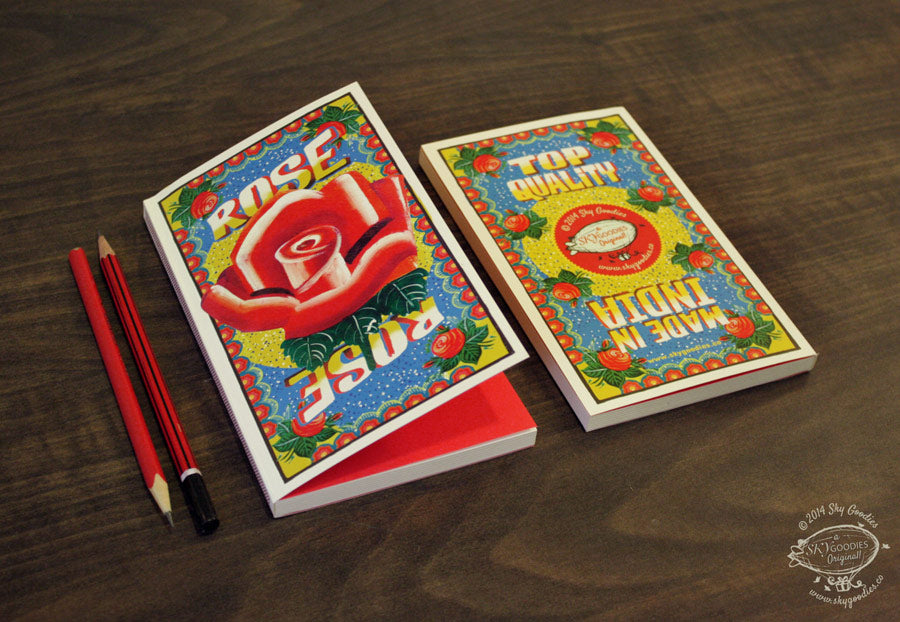 Indian match box and truck art, on the cover of a bright cheeky, handy notebook = a MATCH BOOK! To store your notes, dreams, doodles, ideas and everything in between! The hand-painted red rose on this notebook, can be found on countless Indian trucks.