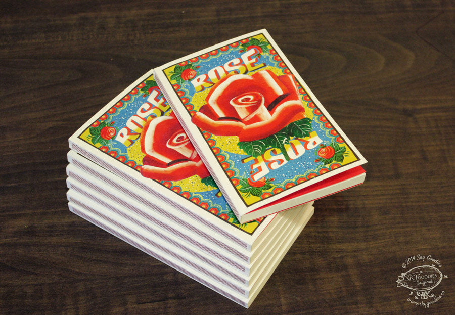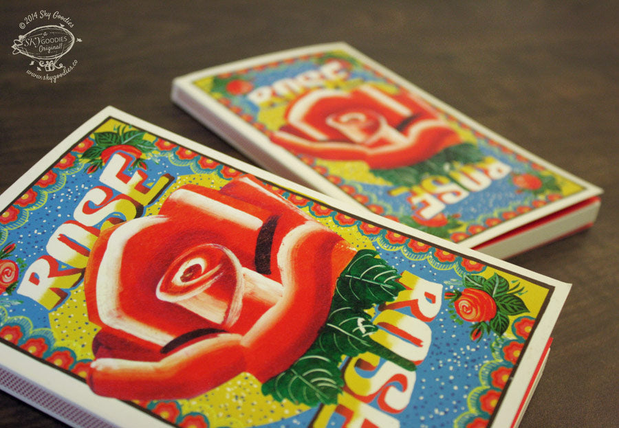 The art of each notebook in this series is a mix of Indian truck graphics and hand-painted street art. The spine has a faux match box striker strip. Designed exclusively by Sky Goodies, these cool notebooks complement each other as a set, for yourself or as a gift.