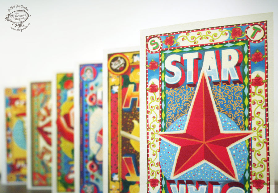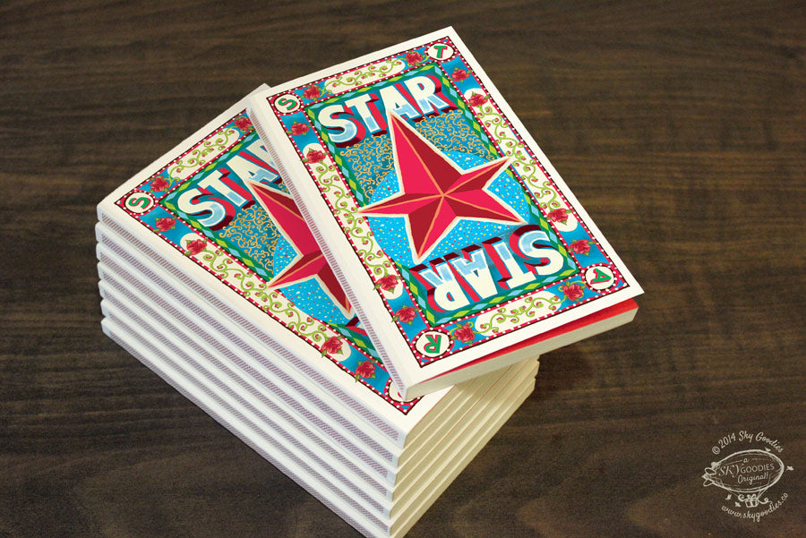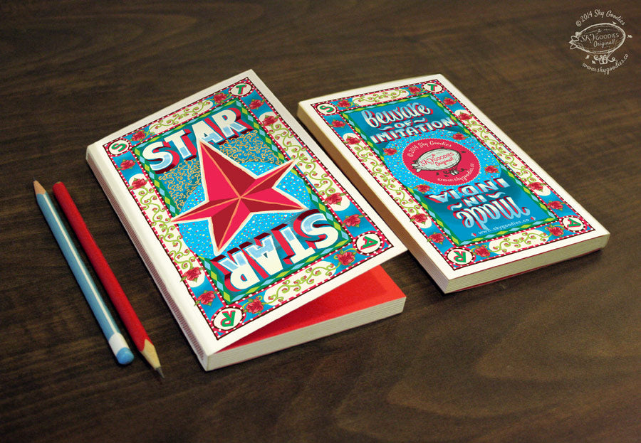 The art of each notebook in this series is a mix of Indian truck graphics and hand-painted street art. The spine has a faux match box striker strip. Designed exclusively by Sky Goodies, these cool notebooks complement each other as a set, for yourself or as a gift.