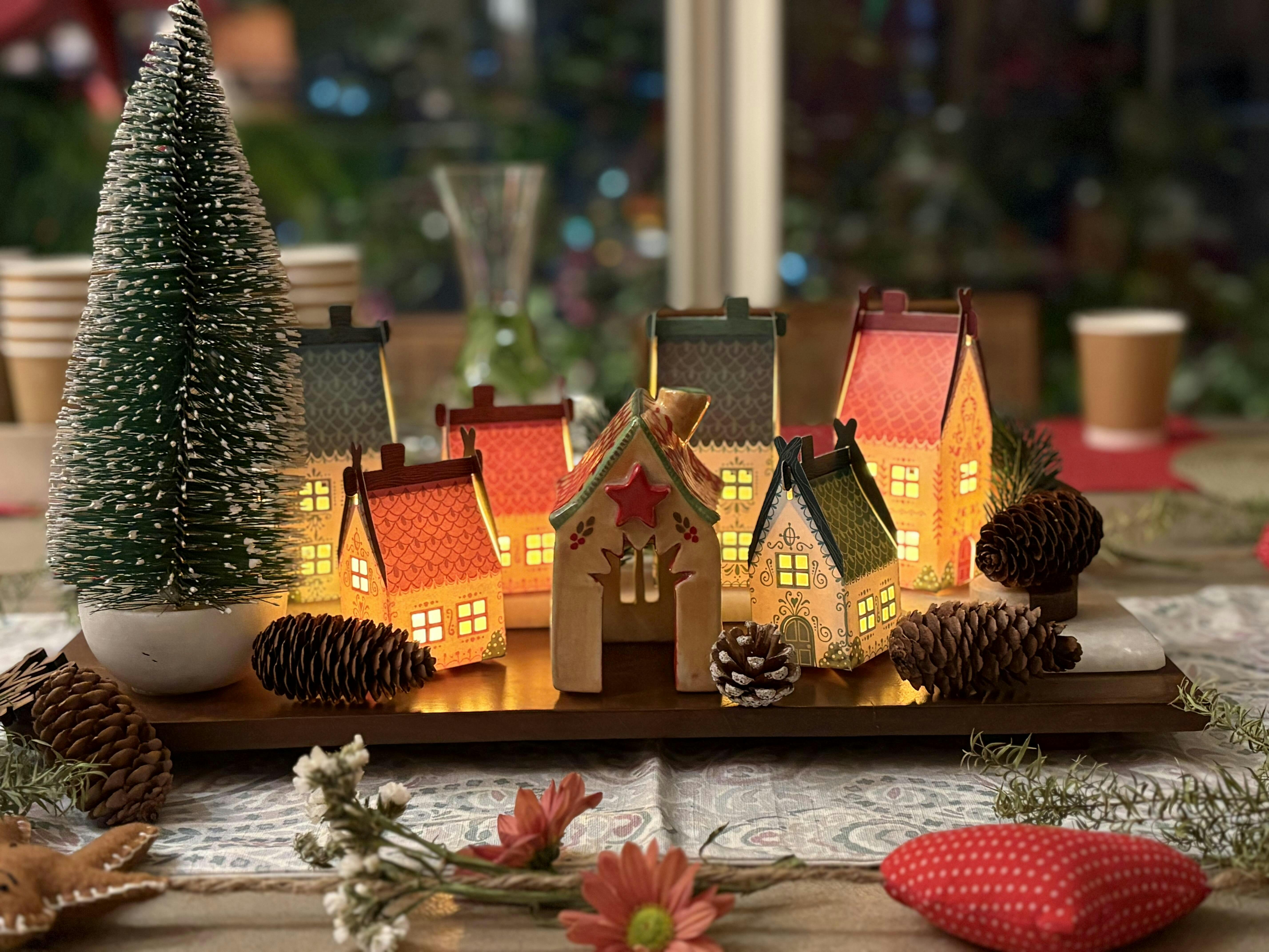 What makes this Christmas village truly special is that the houses can glow in the evenings! The set includes 6 battery-operated tea light candles. Simply place the tea lights inside each house, and watch as the soft, warm glow illuminates your village, creating a cozy, festive atmosphere. Perfect for display on mantels, tabletops, or as a centrepiece, this mini village adds a whimsical and welcoming touch to your holiday celebrations. Bring the spirit of the Christmas season to life with this delightful, hands-on project that combines creativity and holiday magic.