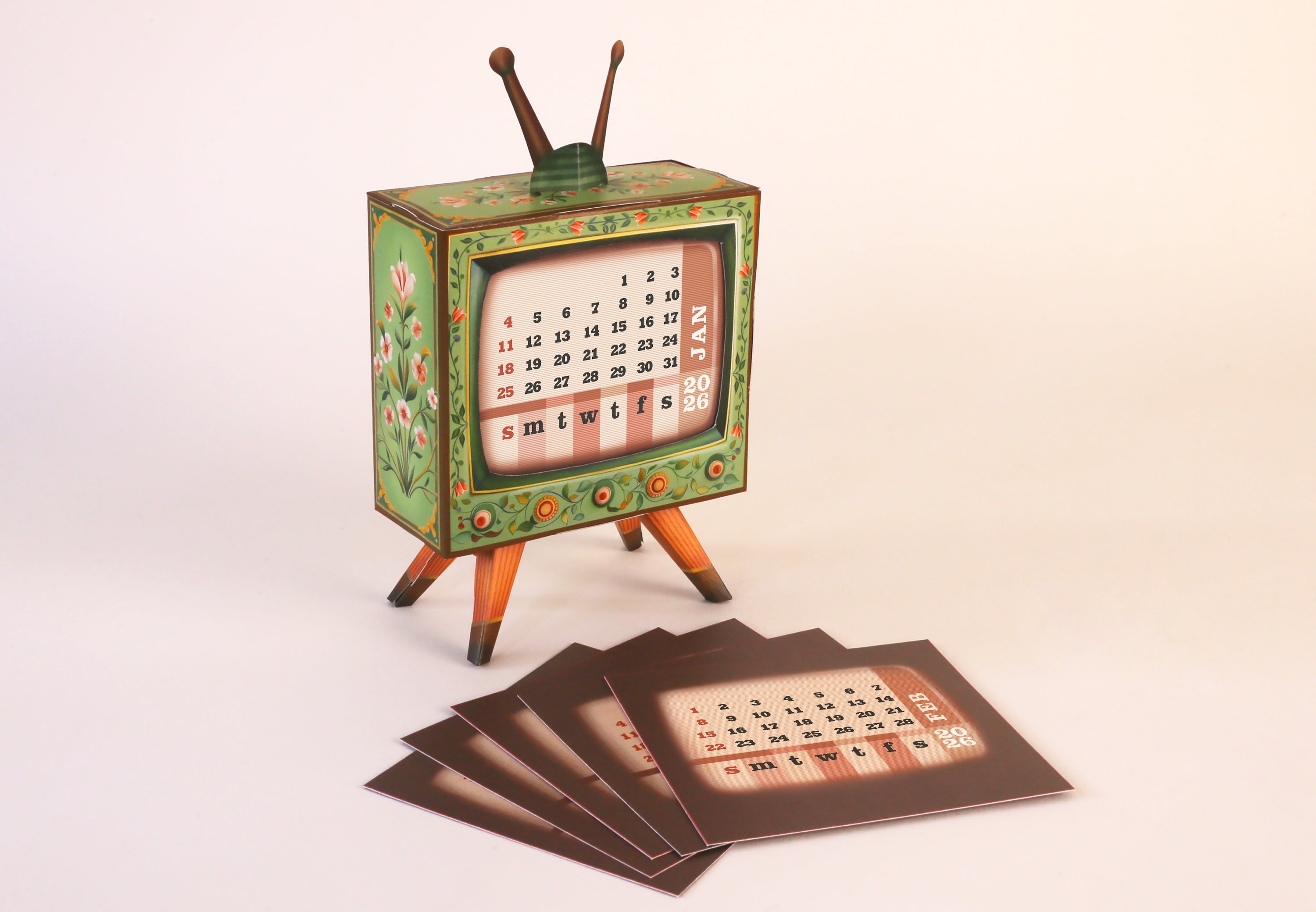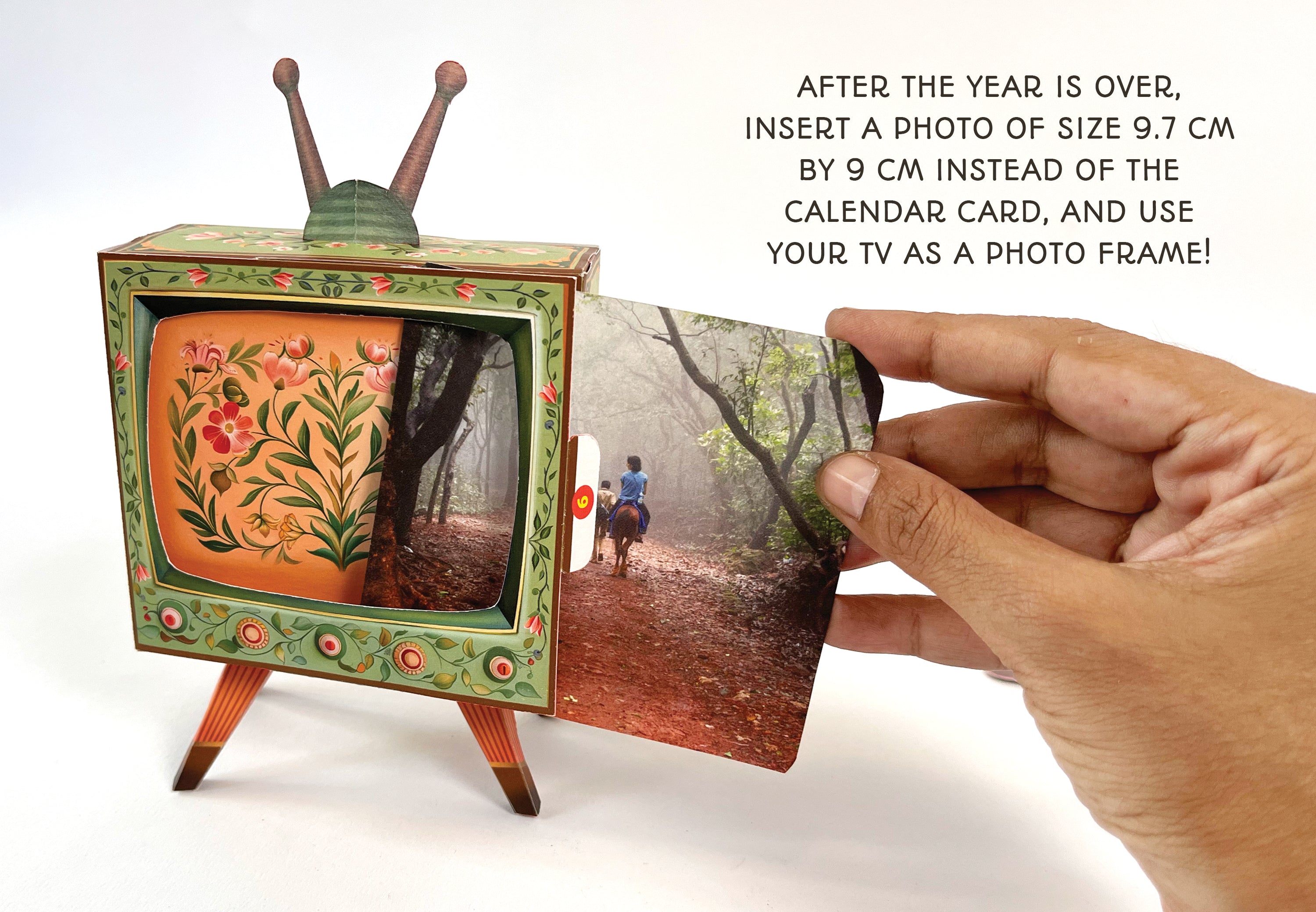 This DIY paper craft kit has been lovingly illustrated with hand-drawn details. Every month, you can simply change the dates in the screen of the TV. Pre-printed, pre-cut and pre-scored with fold lines. Ready-to-assemble, with just slots. Made in India, made with love. And made by you!