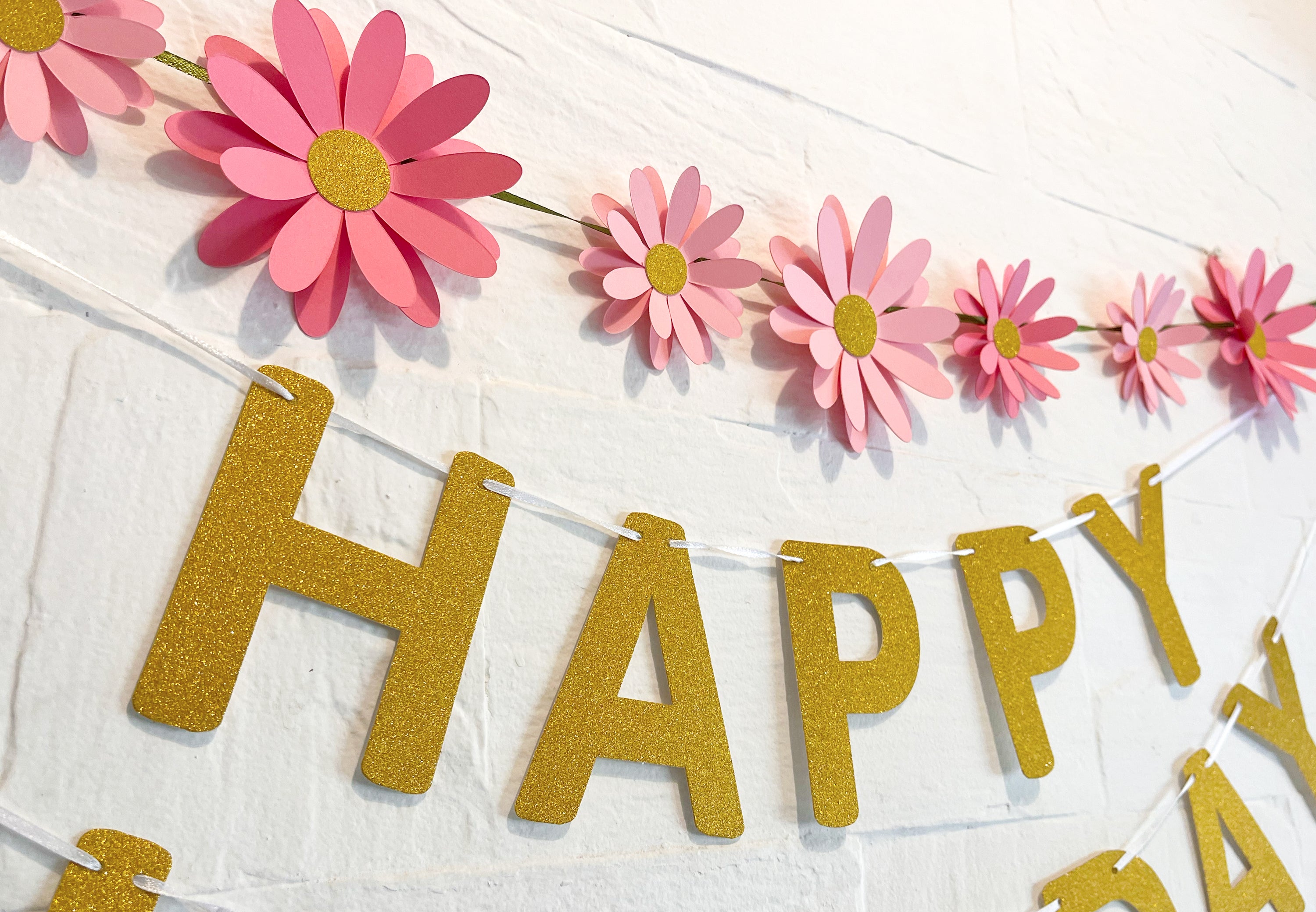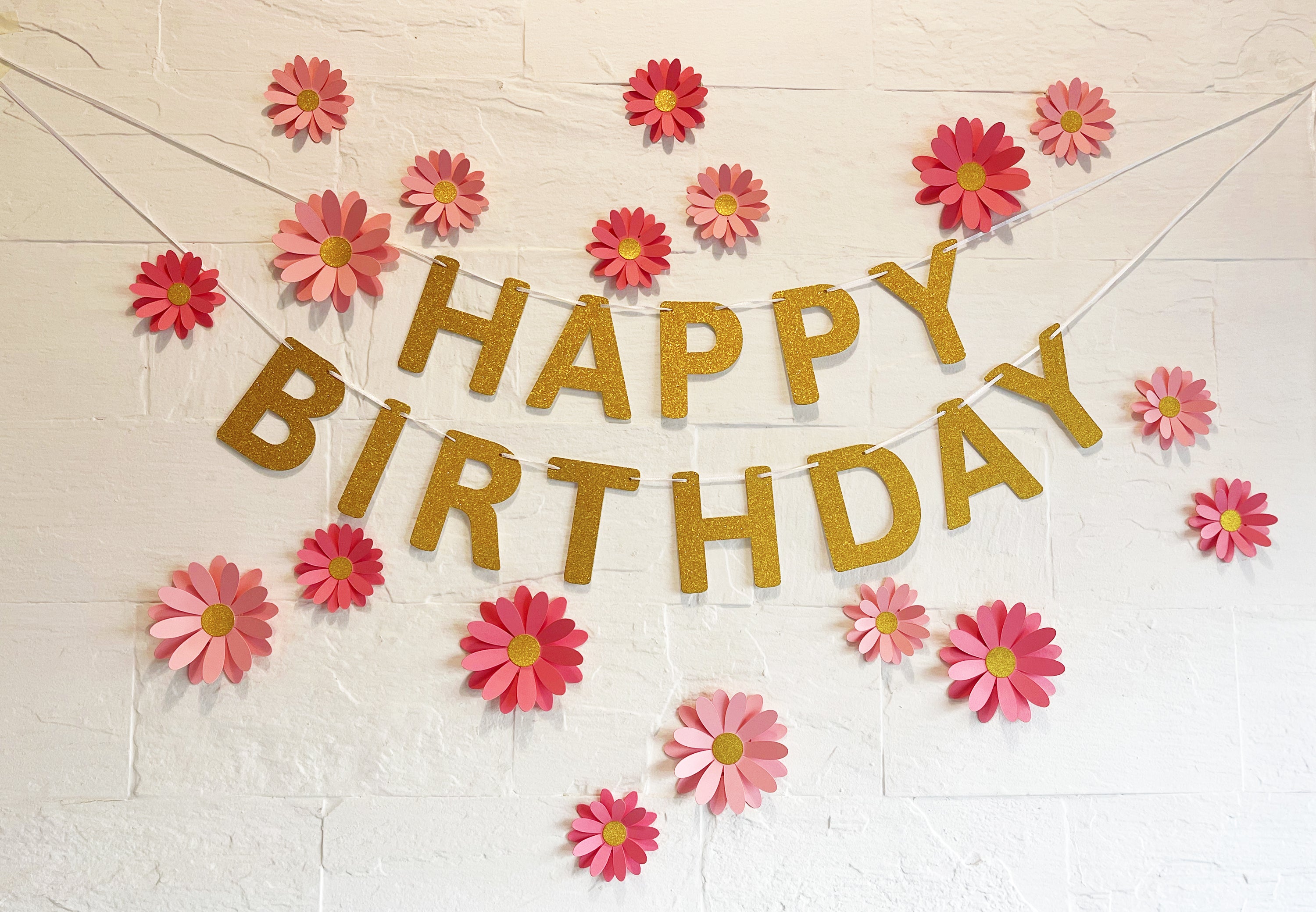 This set comes with 18 double-layered daisy flowers, 10 feet of white satin ribbon, and glitter-gold 'Happy Birthday' letters. You can choose to hang the bunting vertically or horizontally, or scatter the flowers in any desired pattern on the wall. This bunting is especially useful for home decor for rented spaces, as you don't need to drill holes in the wall... you can simply tape the string to the wall!Â