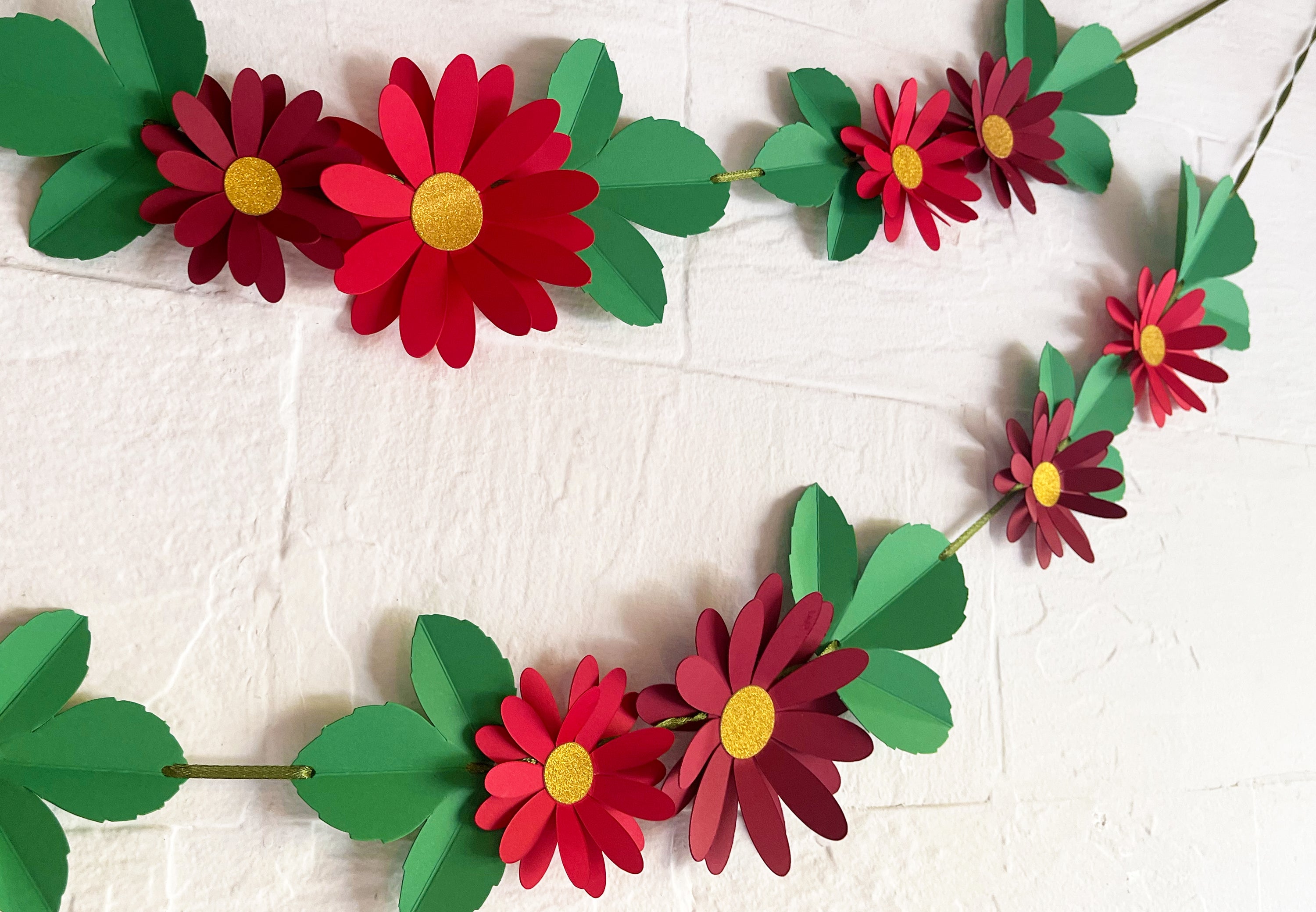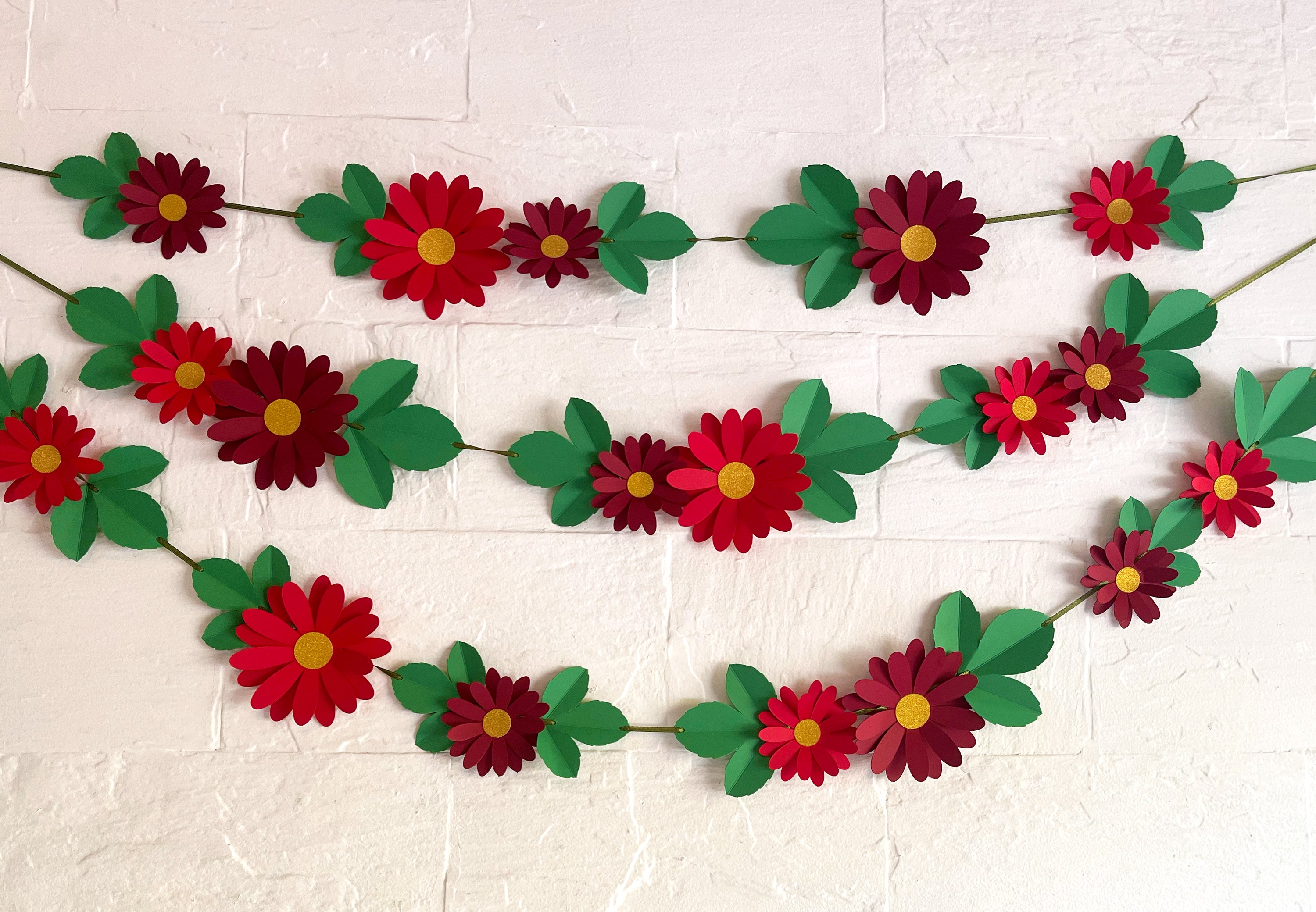 Each flower is carefully crafted from thick, 250 gsm paper with a double-layer design, allowing you to bend the upper layer of petals to create a stunning 3D effect. The leaves are sturdy and pre-creased, making them easy to fold into beautiful 3D shapes. Made from premium paper, our Red Daisy Flower & Leaves Paper Floral Bunting is both durable and visually appealing, making it a perfect choice for any occasion—whether it's a birthday, pooja, baby shower, bridal shower, or simply adding a natural touch to your living room!