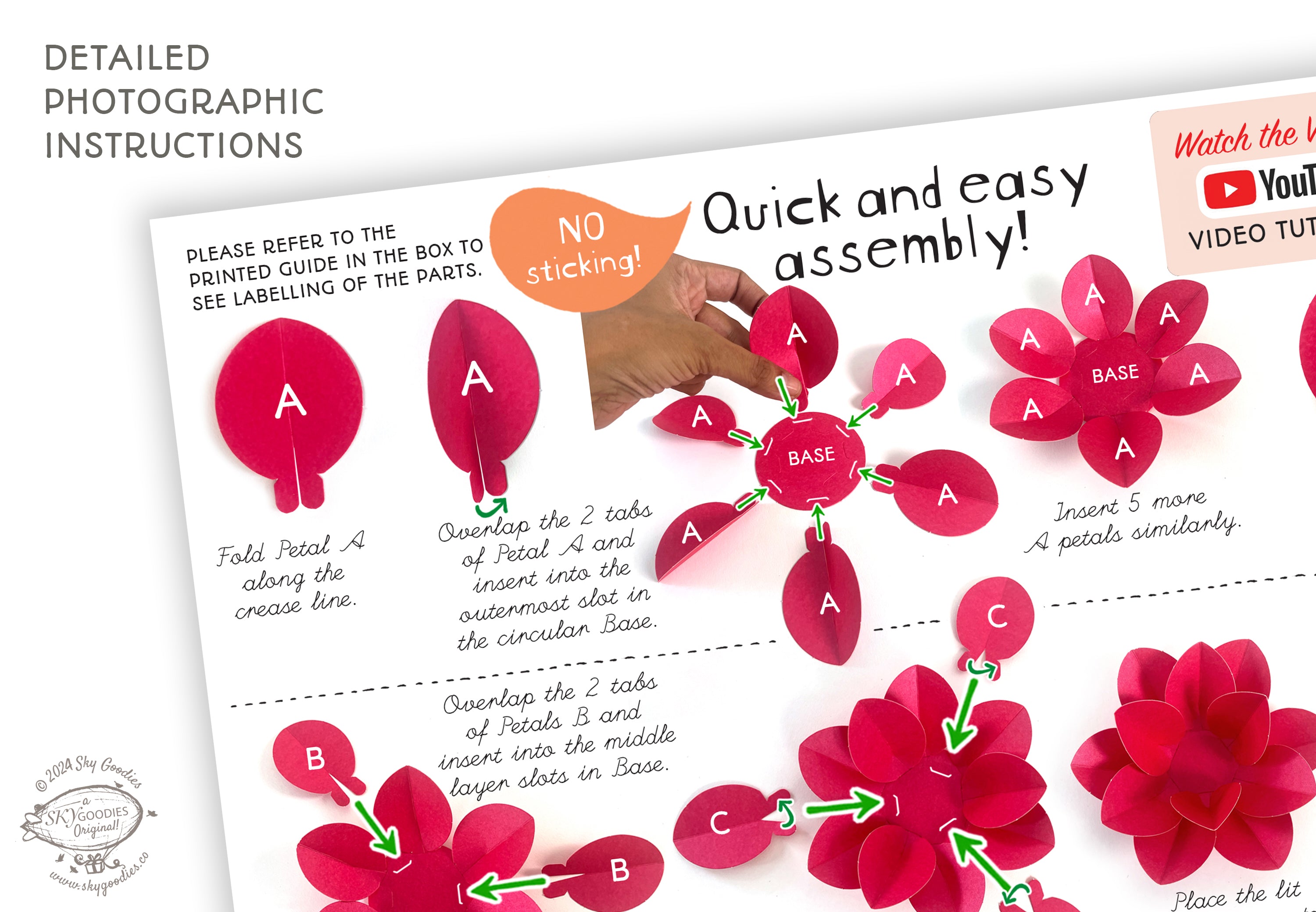 To make the assembly process easy and enjoyable, we’ve created a video tutorial on YouTube, guiding you through each step. This calming activity is perfect for enjoying solo or with loved ones, fostering creativity and connection. Plus, when the celebrations are over, you can easily detach the petals, flatten them, and store them for your next occasion. Embrace the joy of crafting with our delightful Papercraft Kit!
