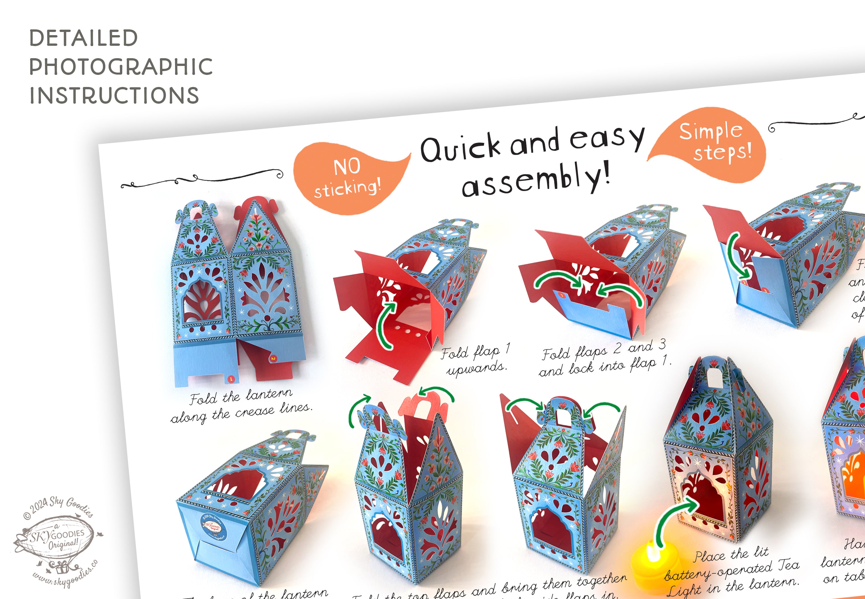 - 6 pre-cut, pre-creased, pre-stuck lanterns