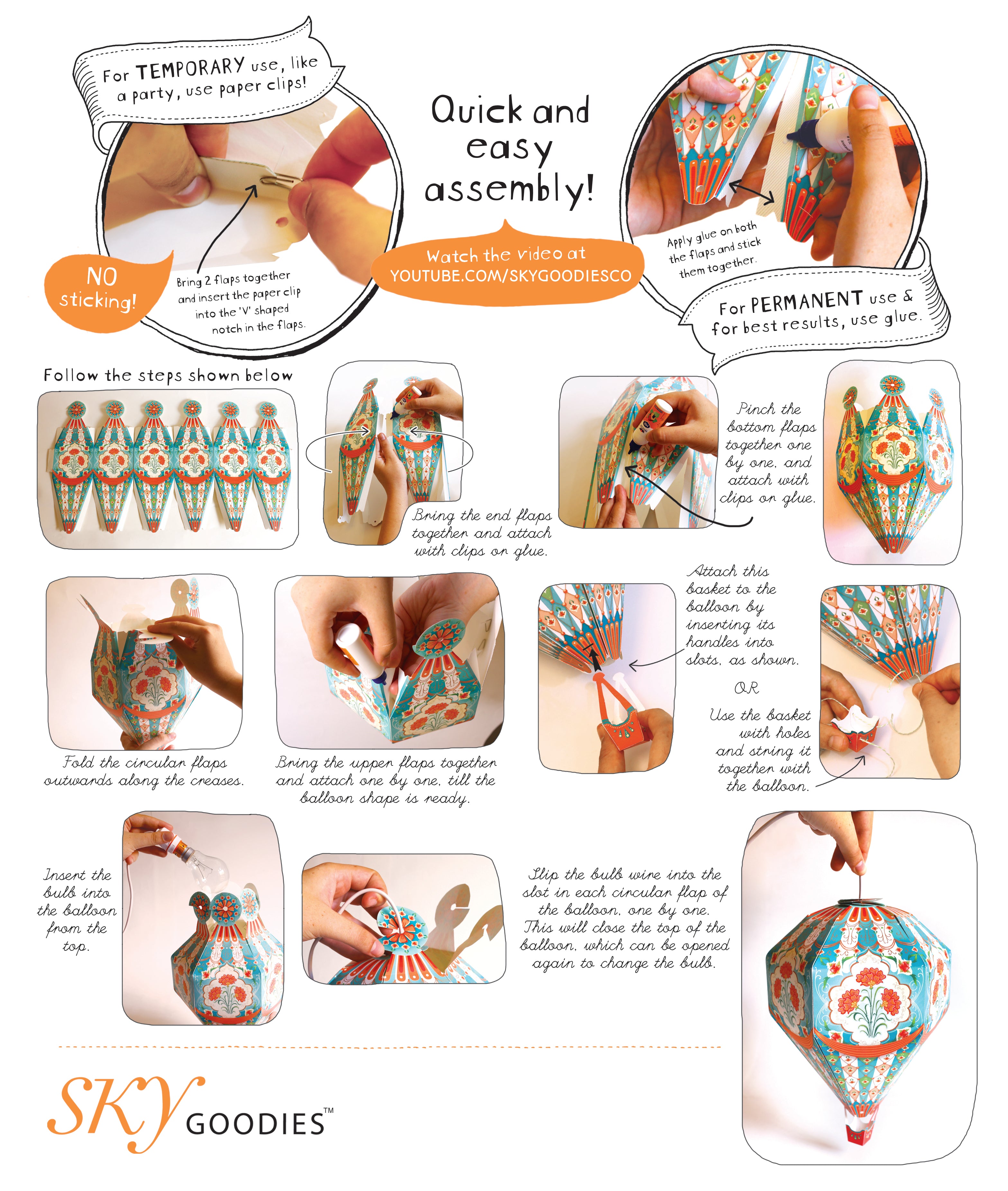 Sit back with your friends or family and enjoy making a beautiful Hot Air Balloon paper lamp shade for your home. This colourful and easy paper craft kit come with pre-cut sheets, string and paper clips included for assembly. For long term use, glue the lamp together, or for short term use, assemble it with the paper clips provided in the kit. You will need a hanging bulb to attach the lamp shade. This is a must-have paper craft for home decoration during festivals and celebrations.