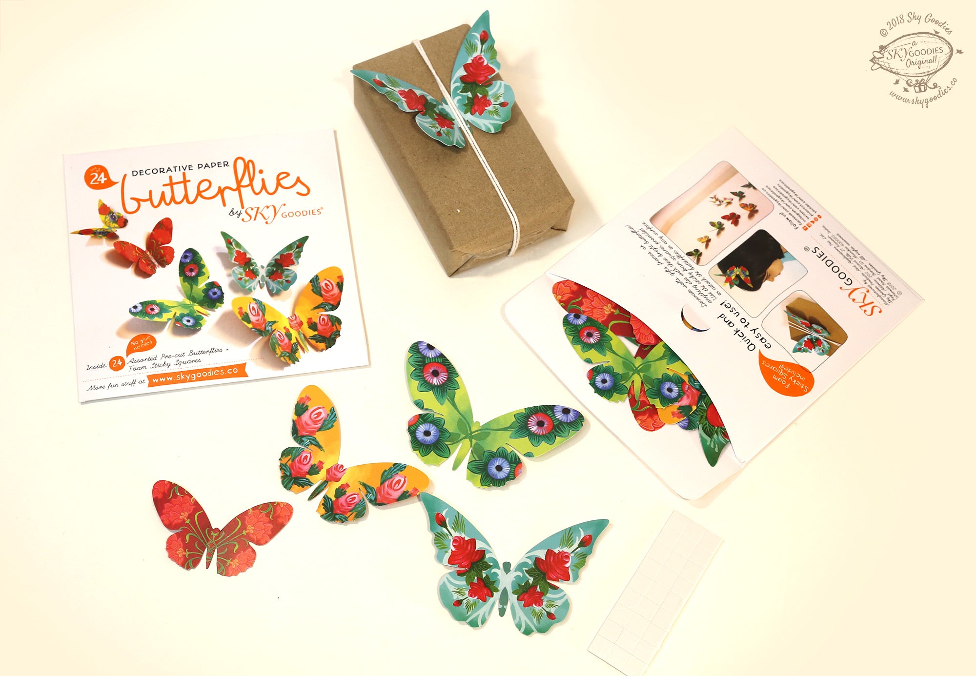 Finished size of each mini flower is 9 cm (length) by 6.5 cm (diameter) or 3.5 inches (length) by 2.5 inches (diameter). The 24 pre-cut paper butterflies come in assorted designs and colours, the average size being 3.5 by 2.5 inches.